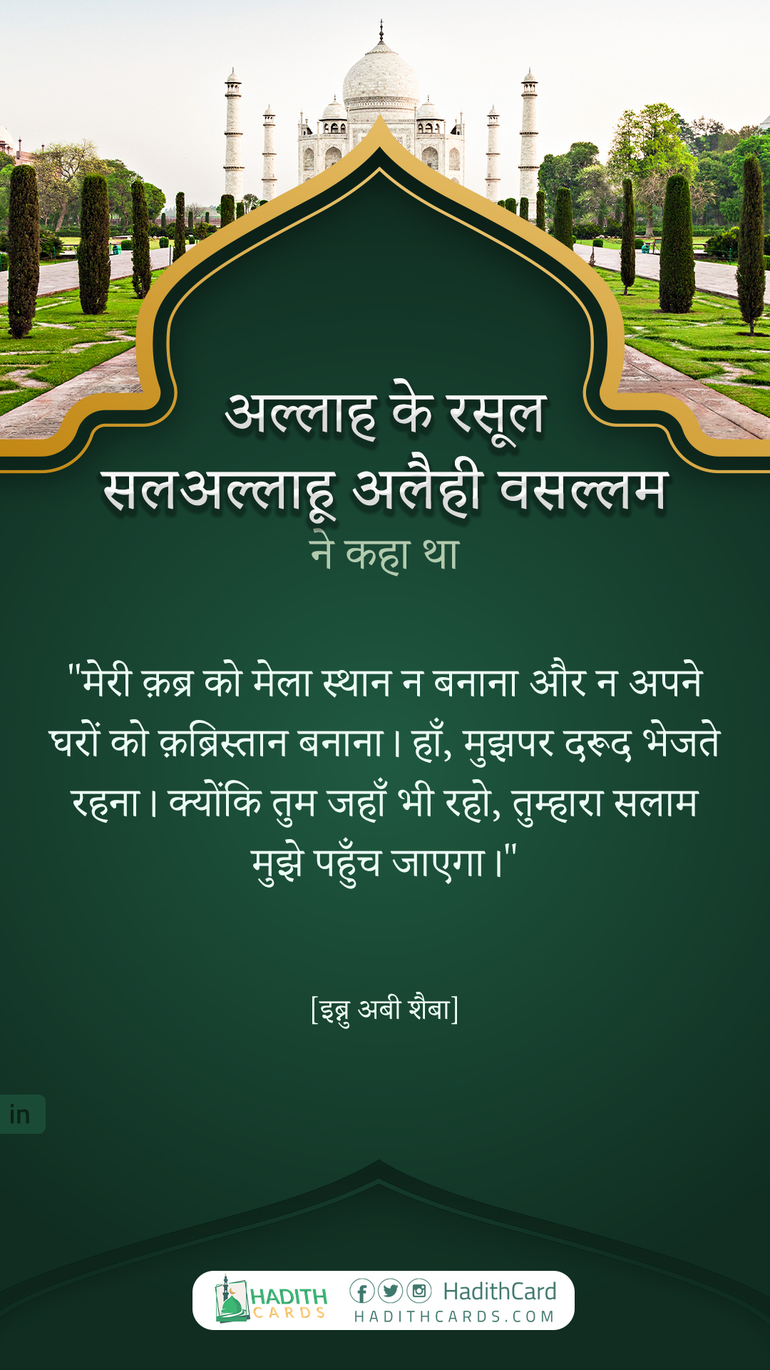 मेरी क़ब्र को मेला स्थान न बनाना और न अपने घरों को क़ब्रिस्तान बनाना। हाँ, मुझपर दरूद भेजते रहना। क्योंकि तुम जहाँ भी रहो, तुम्हारा सलाम मुझे पहुँच जाएगा।