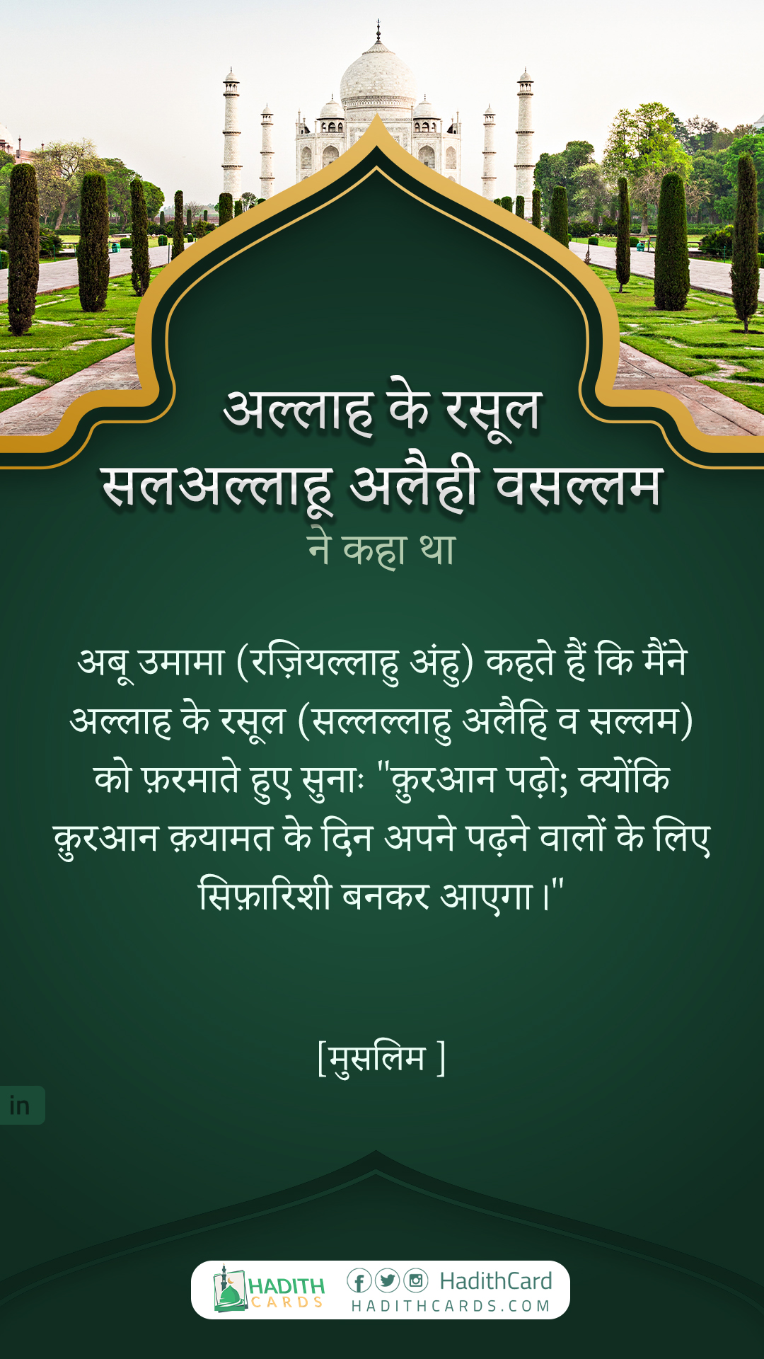 अबू उमामा (रज़ियल्लाहु अंहु) कहते हैं कि मैंने अल्लाह के रसूल (सल्लल्लाहु अलैहि व सल्लम) को फ़रमाते हुए सुनाः "क़ुरआन पढ़ो; क्योंकि क़ुरआन क़यामत के दिन अपने पढ़ने वालों के लिए सिफ़ारिशी बनकर आएगा।