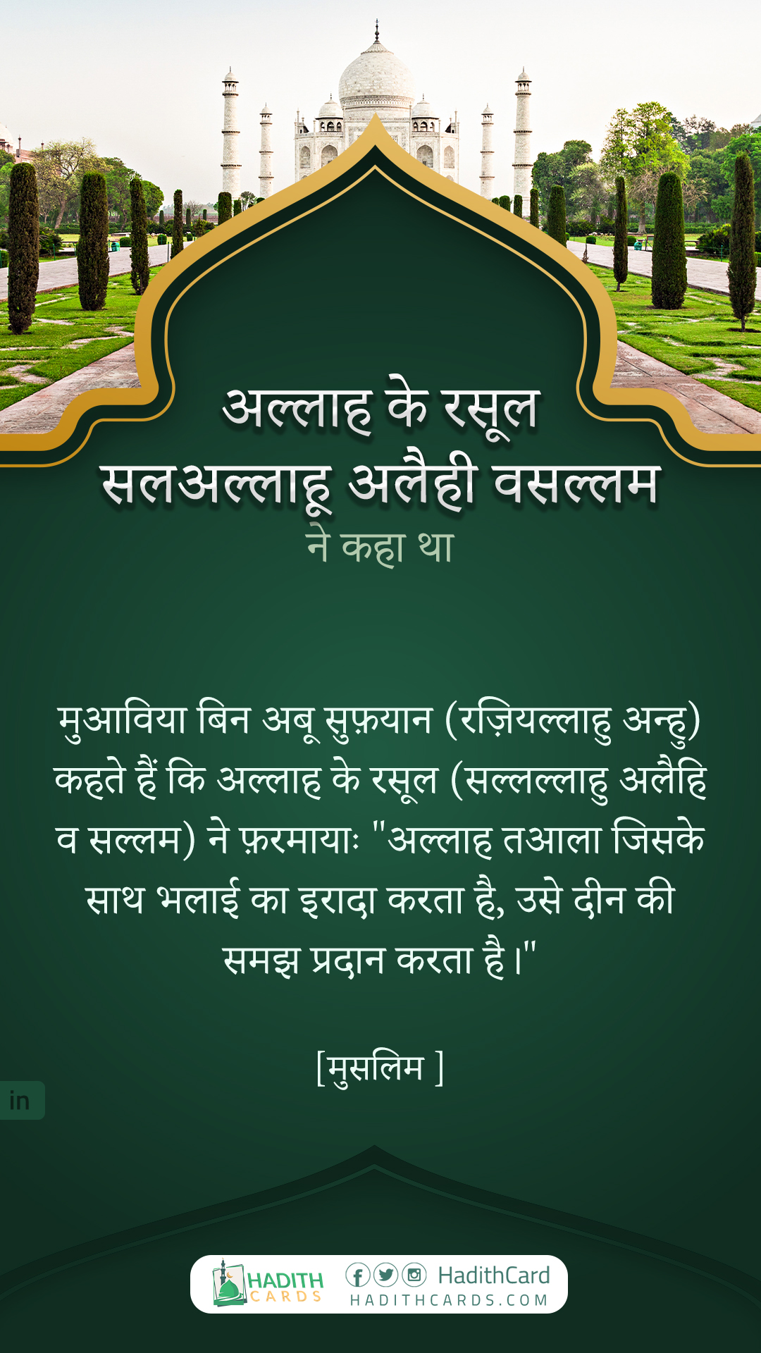 मुआविया बिन अबू सुफ़यान (रज़ियल्लाहु अन्हु) कहते हैं कि अल्लाह के रसूल (सल्लल्लाहु अलैहि व सल्लम) ने फ़रमायाः "अल्लाह तआला जिसके साथ भलाई का इरादा करता है, उसे दीन की समझ प्रदान करता है।