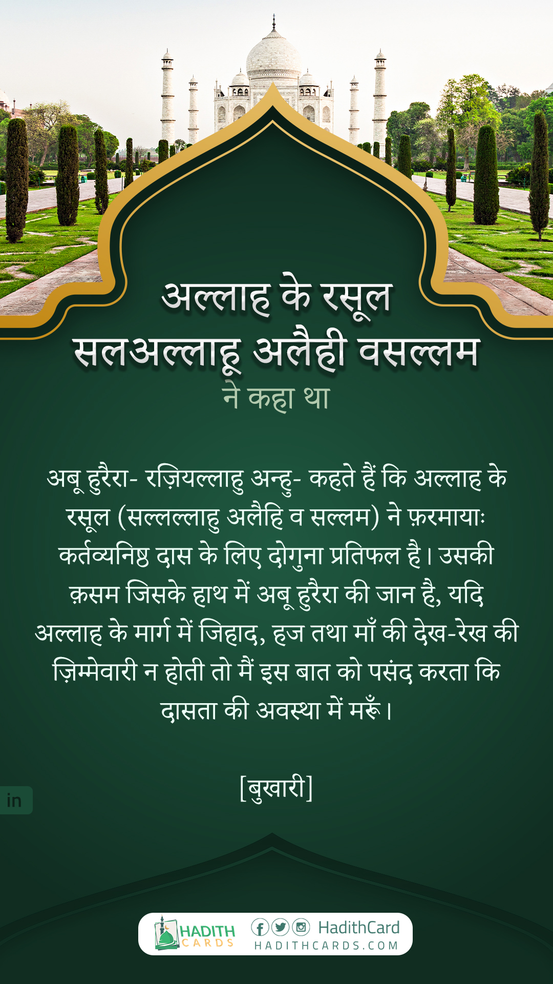 अबू हुरैरा- रज़ियल्लाहु अन्हु- कहते हैं कि अल्लाह के रसूल (सल्लल्लाहु अलैहि व सल्लम) ने फ़रमायाः कर्तव्यनिष्ठ दास के लिए दोगुना प्रतिफल है। उसकी क़सम जिसके हाथ में अबू हुरैरा की जान है, यदि अल्लाह के मार्ग में जिहाद, हज तथा माँ की देख-रेख की ज़िम्मेवारी न होती तो मैं इस बात को पसंद करता कि दासता की अवस्था में मरूँ।