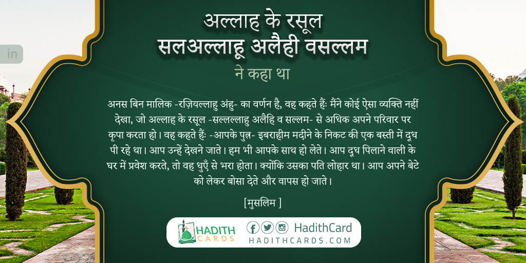 अनस बिन मालिक -रज़ियल्लाहु अंहु- का वर्णन है, वह कहते हैंः मैंने कोई ऐसा व्यक्ति नहीं देखा, जो अल्लाह के रसूल -सल्लल्लाहु अलैहि व सल्लम- से अधिक अपने परिवार पर कृपा करता हो। वह कहते हैंः -आपके पुत्र- इबराहीम मदीने के निकट की एक बस्ती में दूध पी रहे था। आप उन्हें देखने जाते। हम भी आपके साथ हो लेते। आप दूध पिलाने वाली के घर में प्रवेश करते, तो वह धुएँ से भरा होता। क्योंकि उसका पति लोहार था। आप अपने बेटे को लेकर बोसा देते और वापस हो जाते।