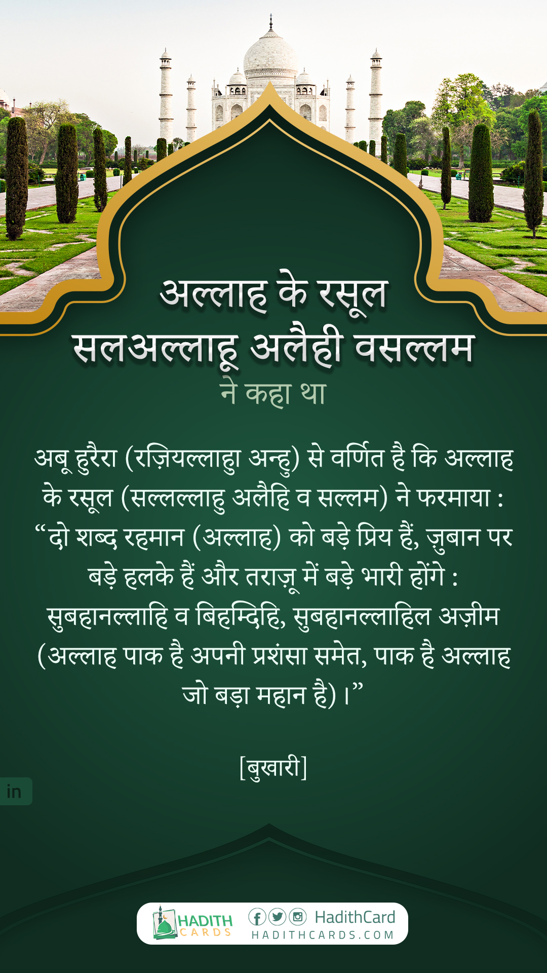 अबू हुरैरा (रज़ियल्लाहुा अन्हु) से वर्णित है कि अल्लाह के रसूल (सल्लल्लाहु अलैहि व सल्लम) ने फरमाया : “दो शब्द रहमान (अल्लाह) को बड़े प्रिय हैं, ज़ुबान पर बड़े हलके हैं और तराज़ू में बड़े भारी होंगे : सुबहानल्लाहि व बिहम्दिहि, सुबहानल्लाहिल अज़ीम (अल्लाह पाक है अपनी प्रशंसा समेत, पाक है अल्लाह जो बड़ा महान है)।”