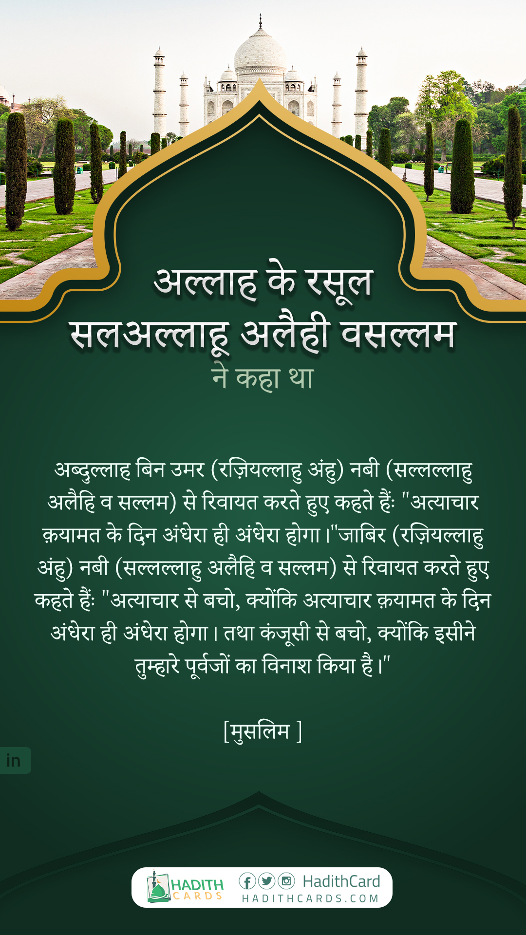 अब्दुल्लाह बिन उमर (रज़ियल्लाहु अंहु) नबी (सल्लल्लाहु अलैहि व सल्लम) से रिवायत करते हुए कहते हैंः "अत्याचार क़यामत के दिन अंधेरा ही अंधेरा होगा।"जाबिर (रज़ियल्लाहु अंहु) नबी (सल्लल्लाहु अलैहि व सल्लम) से रिवायत करते हुए कहते हैंः "अत्याचार से बचो, क्योंकि अत्याचार क़यामत के दिन अंधेरा ही अंधेरा होगा। तथा कंजूसी से बचो, क्योंकि इसीने तुम्हारे पूर्वजों का विनाश किया है।