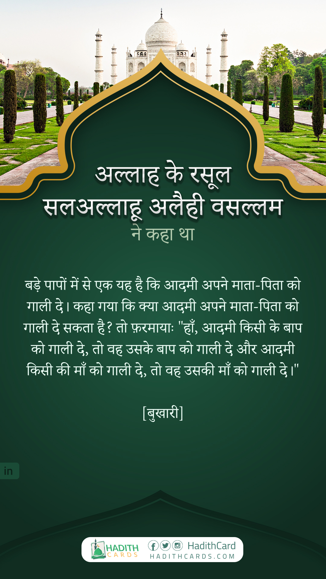 बड़े पापों में से एक यह है कि आदमी अपने माता-पिता को गाली दे। कहा गया कि क्या आदमी अपने माता-पिता को गाली दे सकता है? तो फ़रमायाः "हाँ, आदमी किसी के बाप को गाली दे, तो वह उसके बाप को गाली दे और आदमी किसी की माँ को गाली दे, तो वह उसकी माँ को गाली दे।