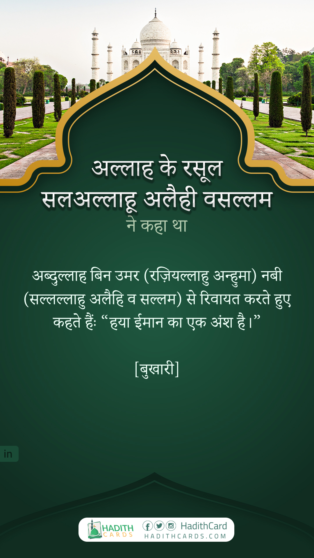 अब्दुल्लाह बिन उमर (रज़ियल्लाहु अन्हुमा) नबी (सल्लल्लाहु अलैहि व सल्लम) से रिवायत करते हुए कहते हैंः “हया ईमान का एक अंश है।