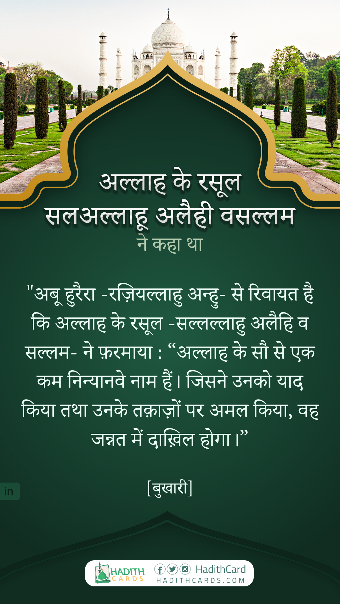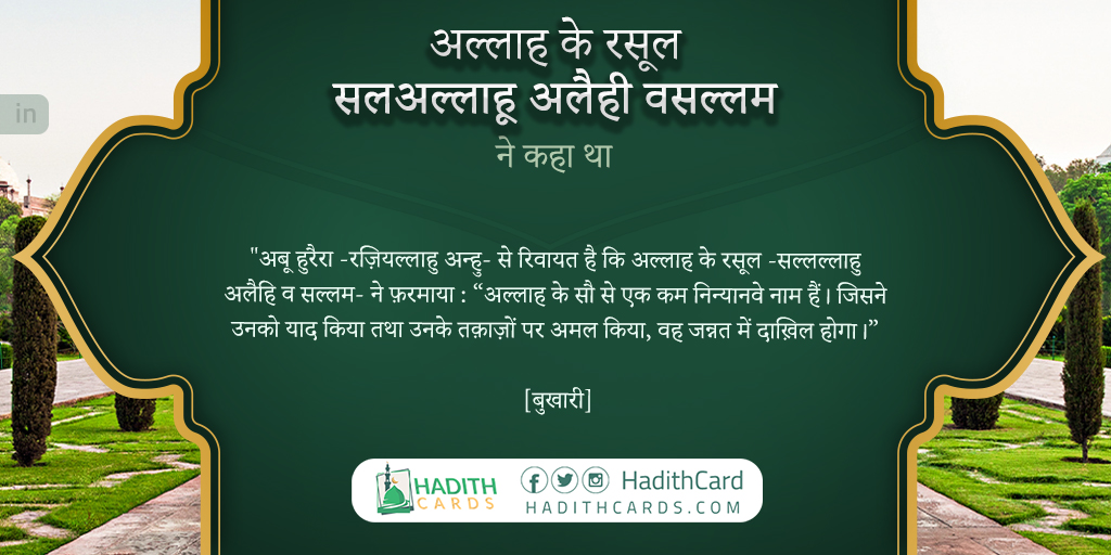 अबू हुरैरा -रज़ियल्लाहु अन्हु- से रिवायत है कि अल्लाह के रसूल -सल्लल्लाहु अलैहि व सल्लम- ने फ़रमाया : “अल्लाह के सौ से एक कम निन्यानवे नाम हैं। जिसने उनको याद किया तथा उनके तक़ाज़ों पर अमल किया, वह जन्नत में दाख़िल होगा।