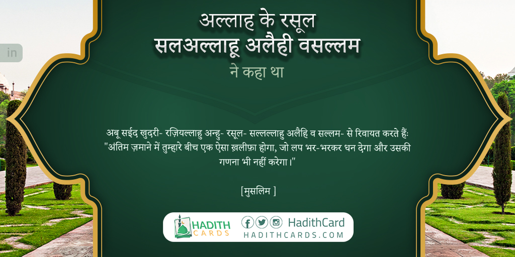अबू सईद खुदरी- रज़ियल्लाहु अन्हु- रसूल- सल्लल्लाहु अलैहि व सल्लम- से रिवायत करते हैंः "अंतिम ज़माने में तुम्हारे बीच एक ऐसा ख़लीफ़ा होगा, जो लप भर-भरकर धन देगा और उसकी गणना भी नहीं करेगा।