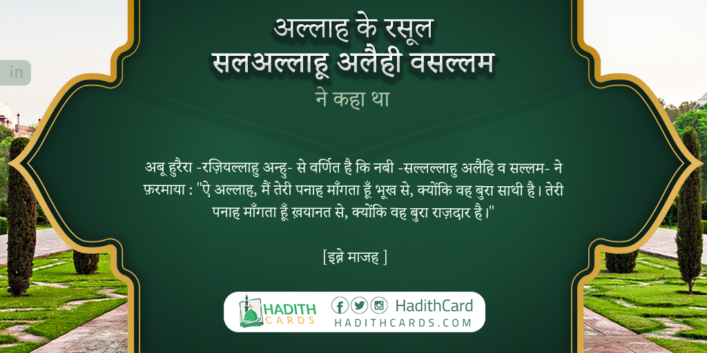 अबू हुरैरा -रज़ियल्लाहु अन्हु- से वर्णित है कि नबी -सल्लल्लाहु अलैहि व सल्लम- ने फ़रमाया : "ऐ अल्लाह, मैं तेरी पनाह माँगता हूँ भूख से, क्योंकि वह बुरा साथी है। तेरी पनाह माँगता हूँ ख़यानत से, क्योंकि वह बुरा राज़दार है।