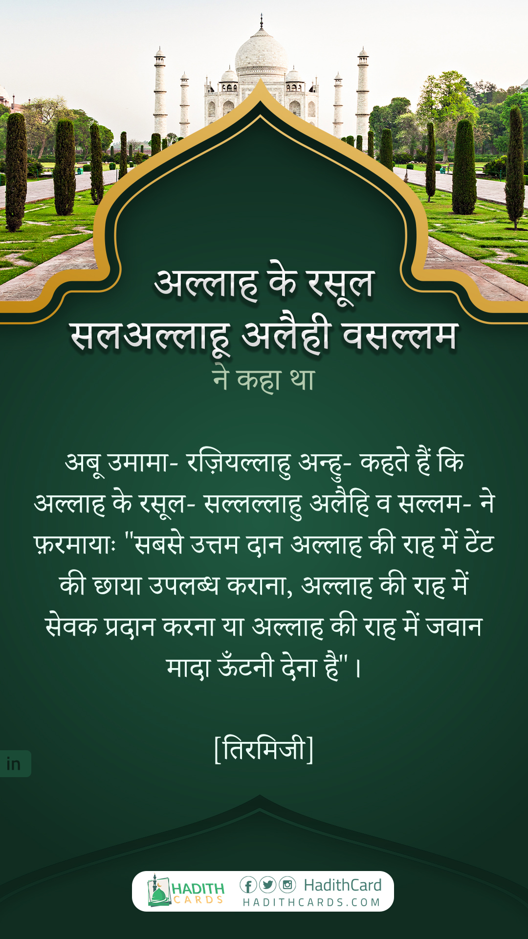 अबू उमामा- रज़ियल्लाहु अन्हु- कहते हैं कि अल्लाह के रसूल- सल्लल्लाहु अलैहि व सल्लम- ने फ़रमायाः "सबसे उत्तम दान अल्लाह की राह में टेंट की छाया उपलब्ध कराना, अल्लाह की राह में सेवक प्रदान करना या अल्लाह की राह में जवान मादा ऊँटनी देना है"।