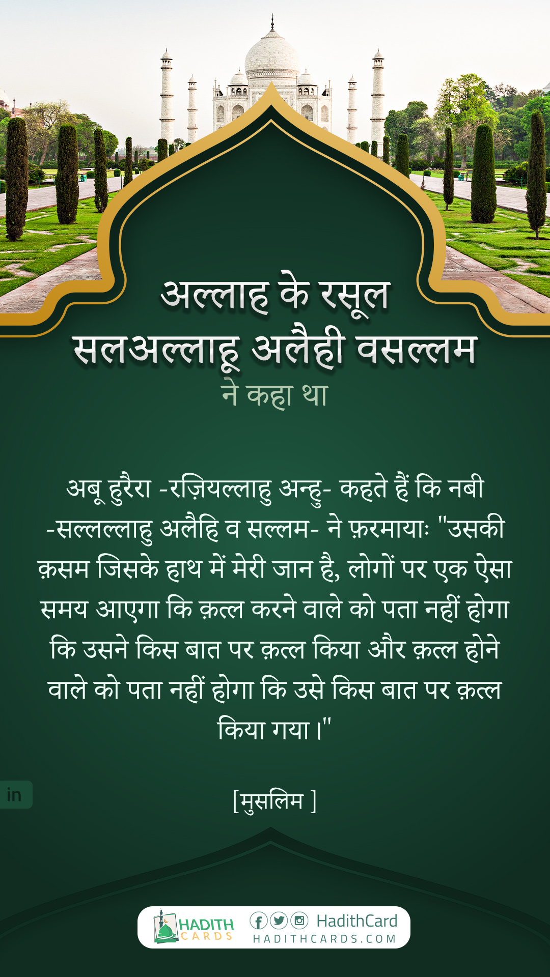 अबू हुरैरा -रज़ियल्लाहु अन्हु- कहते हैं कि नबी -सल्लल्लाहु अलैहि व सल्लम- ने फ़रमायाः "उसकी क़सम जिसके हाथ में मेरी जान है, लोगों पर एक ऐसा समय आएगा कि क़त्ल करने वाले को पता नहीं होगा कि उसने किस बात पर क़त्ल किया और क़त्ल होने वाले को पता नहीं होगा कि उसे किस बात पर क़त्ल किया गया।