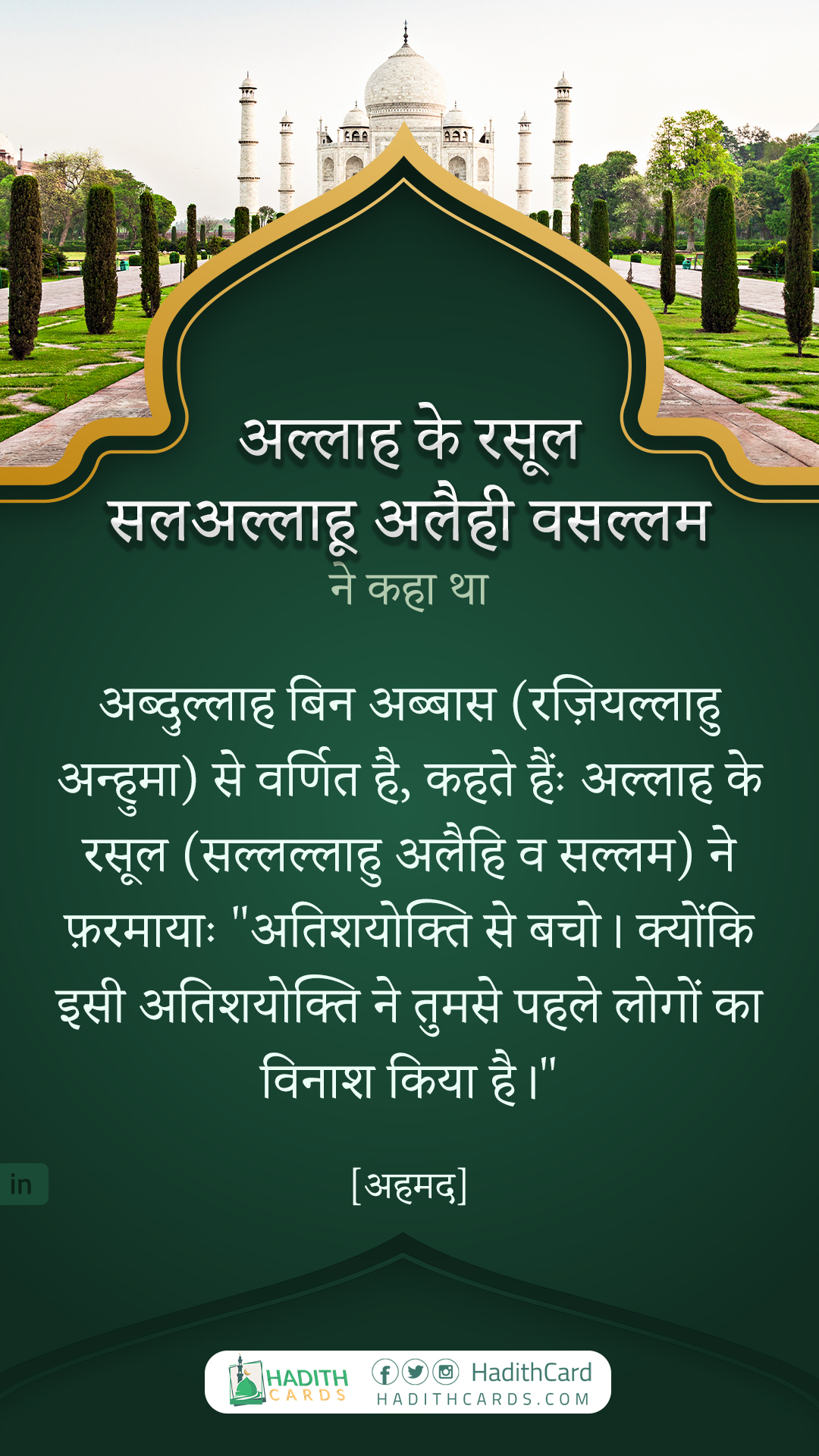 अब्दुल्लाह बिन अब्बास (रज़ियल्लाहु अन्हुमा) से वर्णित है, कहते हैंः अल्लाह के रसूल (सल्लल्लाहु अलैहि व सल्लम) ने फ़रमायाः "अतिशयोक्ति से बचो। क्योंकि इसी अतिशयोक्ति ने तुमसे पहले लोगों का विनाश किया है।