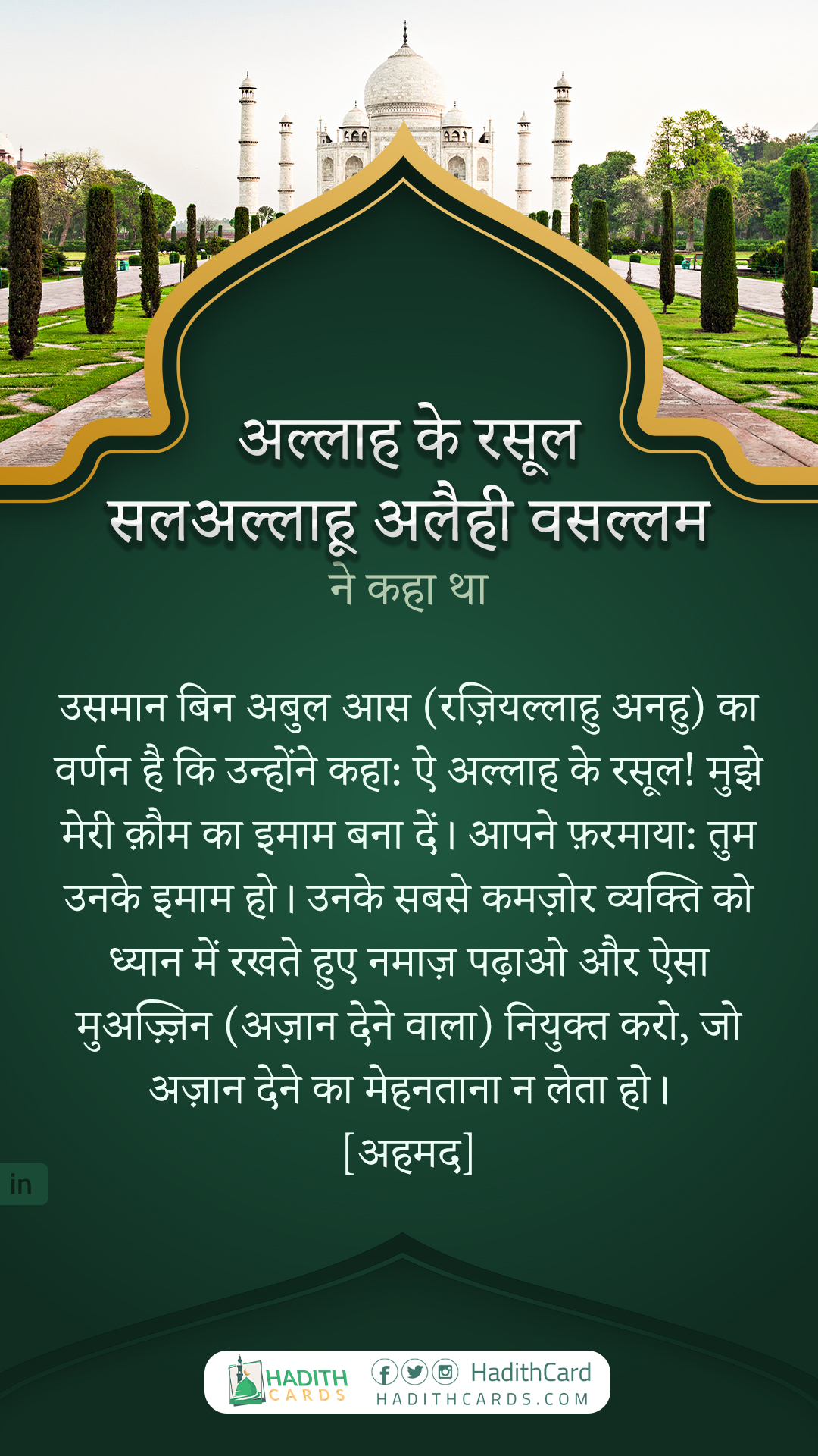 उसमान बिन अबुल आस (रज़ियल्लाहु अनहु) का वर्णन है कि उन्होंने कहा: ऐ अल्लाह के रसूल! मुझे मेरी क़ौम का इमाम बना दें। आपने फ़रमाया: तुम उनके इमाम हो। उनके सबसे कमज़ोर व्यक्ति को ध्यान में रखते हुए नमाज़ पढ़ाओ और ऐसा मुअज़्ज़िन (अज़ान देने वाला) नियुक्त करो, जो अज़ान देने का मेहनताना न लेता हो।