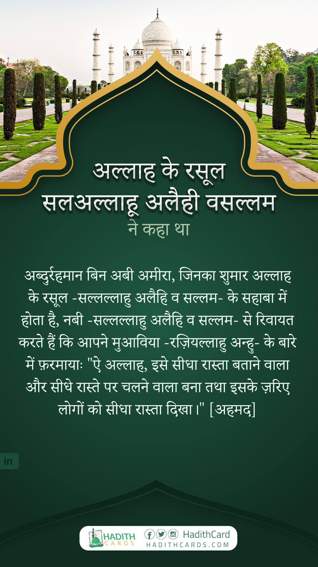 अब्दुर्रहमान बिन अबी अमीरा, जिनका शुमार अल्लाह के रसूल -सल्लल्लाहु अलैहि व सल्लम- के सहाबा में होता है, नबी -सल्लल्लाहु अलैहि व सल्लम- से रिवायत करते हैं कि आपने मुआविया -रज़ियल्लाहु अन्हु- के बारे में फ़रमायाः "ऐ अल्लाह, इसे सीधा रास्ता बताने वाला और सीधे रास्ते पर चलने वाला बना तथा इसके ज़रिए लोगों को सीधा रास्ता दिखा।