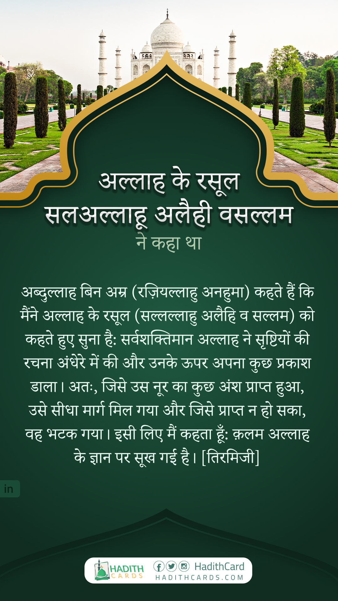 अब्दुल्लाह बिन अम्र (रज़ियल्लाहु अनहुमा) कहते हैं कि मैंने अल्लाह के रसूल (सल्लल्लाहु अलैहि व सल्लम) को कहते हुए सुना है: सर्वशक्तिमान अल्लाह ने सृष्टियों की रचना अंधेरे में की और उनके ऊपर अपना कुछ प्रकाश डाला। अतः, जिसे उस नूर का कुछ अंश प्राप्त हुआ, उसे सीधा मार्ग मिल गया और जिसे प्राप्त न हो सका, वह भटक गया। इसी लिए मैं कहता हूँ: क़लम अल्लाह के ज्ञान पर सूख गई है।