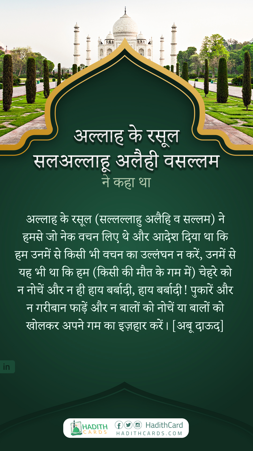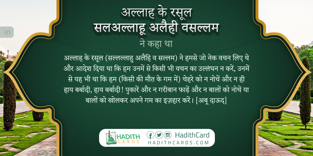 अल्लाह के रसूल (सल्लल्लाहु अलैहि व सल्लम) ने हमसे जो नेक वचन लिए थे और आदेश दिया था कि हम उनमें से किसी भी वचन का उल्लंघन न करें, उनमें से यह भी था कि हम (किसी की मौत के गम में) चेहरे को न नोचें और न ही हाय बर्बादी, हाय बर्बादी! पुकारें और न गरीबान फाड़ें और न बालों को नोचें या बालों को खोलकर अपने गम का इज़हार करें।