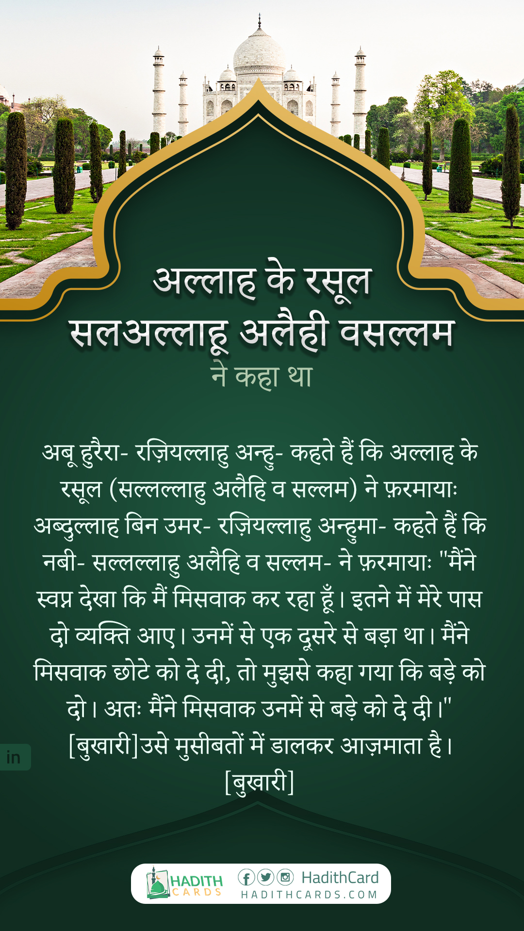 अब्दुल्लाह बिन उमर- रज़ियल्लाहु अन्हुमा- कहते हैं कि नबी- सल्लल्लाहु अलैहि व सल्लम- ने फ़रमायाः "मैंने स्वप्न देखा कि मैं मिसवाक कर रहा हूँ। इतने में मेरे पास दो व्यक्ति आए। उनमें से एक दूसरे से बड़ा था। मैंने मिसवाक छोटे को दे दी, तो मुझसे कहा गया कि बड़े को दो। अतः मैंने मिसवाक उनमें से बड़े को दे दी।