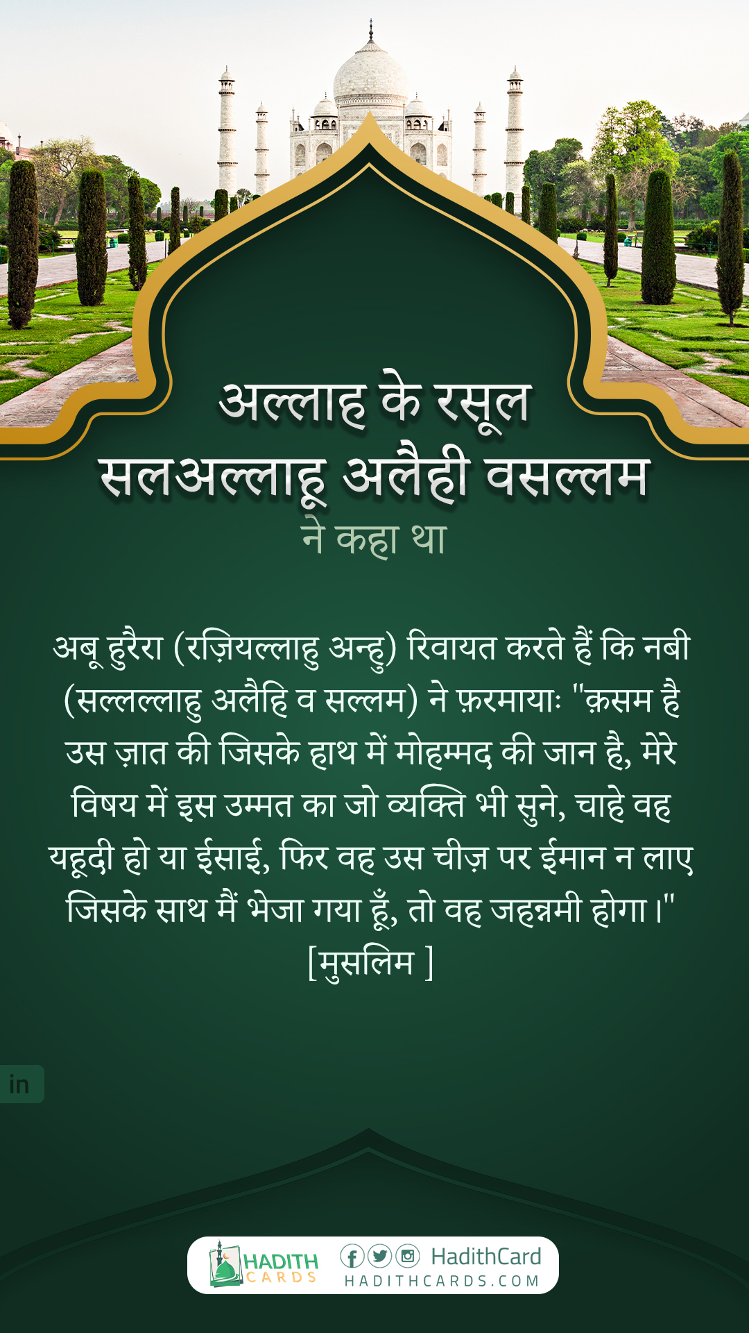 अबू हुरैरा (रज़ियल्लाहु अन्हु) रिवायत करते हैं कि नबी (सल्लल्लाहु अलैहि व सल्लम) ने फ़रमायाः "क़सम है उस ज़ात की जिसके हाथ में मोहम्मद की जान है, मेरे विषय में इस उम्मत का जो व्यक्ति भी सुने, चाहे वह यहूदी हो या ईसाई, फिर वह उस चीज़ पर ईमान न लाए जिसके साथ मैं भेजा गया हूँ, तो वह जहन्नमी होगा।