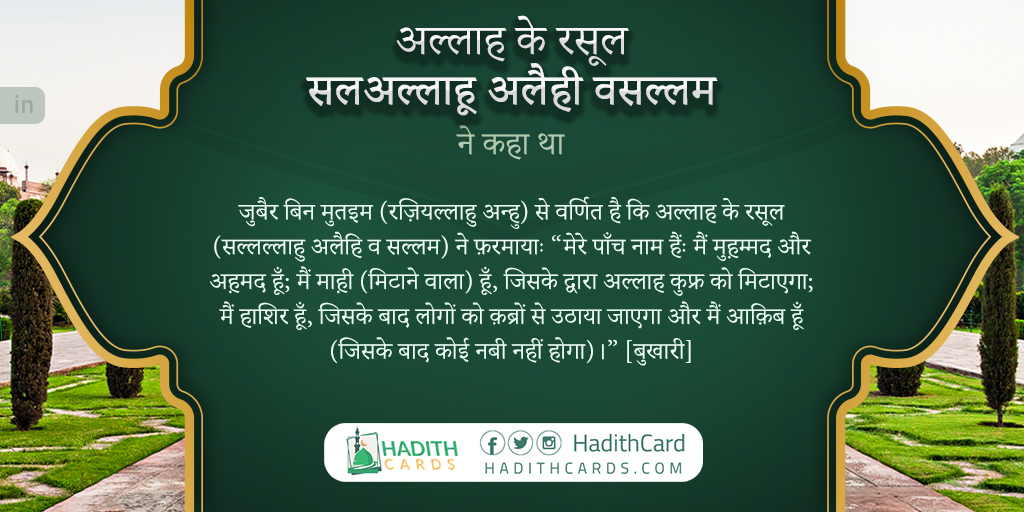 जुबैर बिन मुतइम (रज़ियल्लाहु अन्हु) से वर्णित है कि अल्लाह के रसूल (सल्लल्लाहु अलैहि व सल्लम) ने फ़रमायाः “मेरे पाँच नाम हैंः मैं मुह़म्मद और अह़मद हूँ; मैं माह़ी (मिटाने वाला) हूँ, जिसके द्वारा अल्लाह कुफ्र को मिटाएगा; मैं हाशिर हूँ, जिसके बाद लोगों को क़ब्रों से उठाया जाएगा और मैं आक़िब हूँ (जिसके बाद कोई नबी नहीं होगा)।