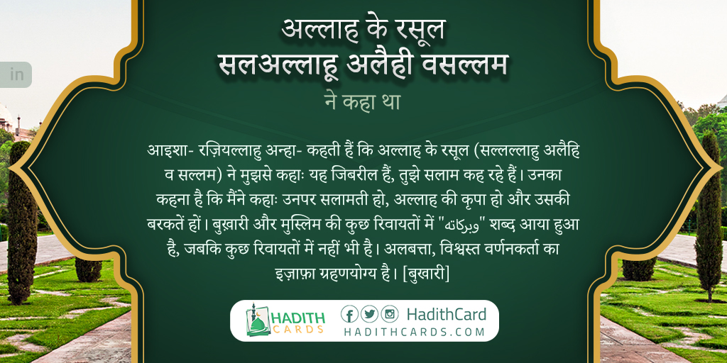 आइशा- रज़ियल्लाहु अन्हा- कहती हैं कि अल्लाह के रसूल (सल्लल्लाहु अलैहि व सल्लम) ने मुझसे कहाः यह जिबरील हैं, तुझे सलाम कह रहे हैं। उनका कहना है कि मैंने कहाः उनपर सलामती हो, अल्लाह की कृपा हो और उसकी बरकतें हों। बुख़ारी और मुस्लिम की कुछ रिवायतों में "وبركاته" शब्द आया हुआ है, जबकि कुछ रिवायतों में नहीं भी है। अलबत्ता, विश्वस्त वर्णनकर्ता का इज़ाफ़ा ग्रहणयोग्य है।