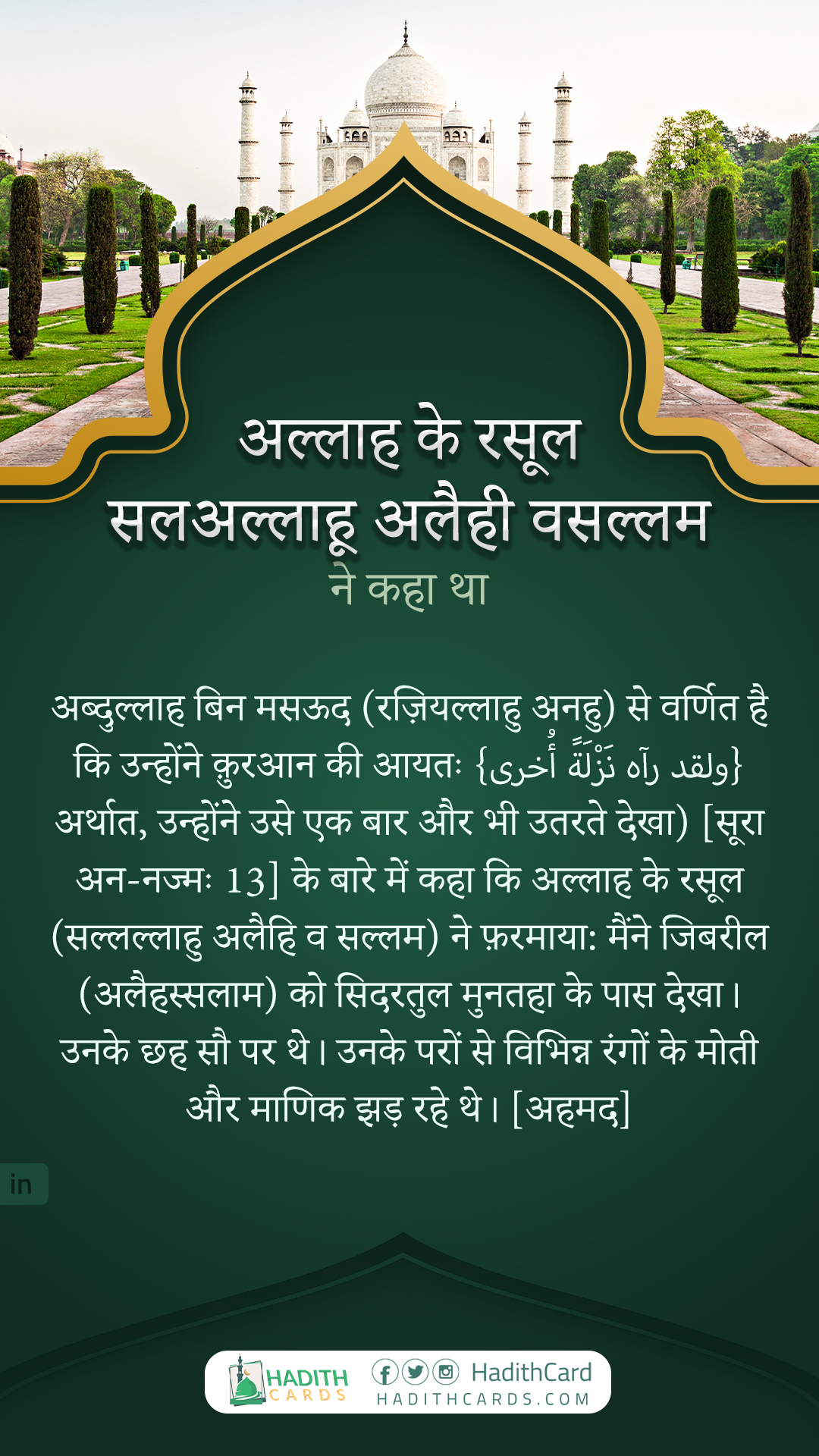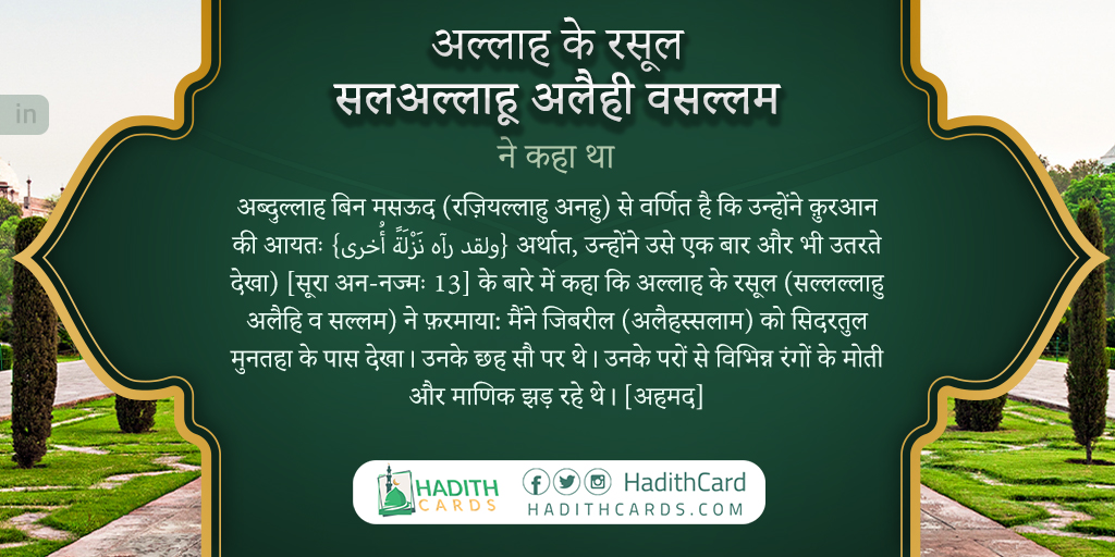अब्दुल्लाह बिन मसऊद (रज़ियल्लाहु अनहु) से वर्णित है कि उन्होंने क़ुरआन की आयतः {ولقد رآه نَزْلَةً أُخرى} अर्थात, उन्होंने उसे एक बार और भी उतरते देखा) [सूरा अन-नज्मः 13] के बारे में कहा कि अल्लाह के रसूल (सल्लल्लाहु अलैहि व सल्लम) ने फ़रमाया: मैंने जिबरील (अलैहस्सलाम) को सिदरतुल मुनतहा के पास देखा। उनके छह सौ पर थे। उनके परों से विभिन्न रंगों के मोती और माणिक झड़ रहे थे।