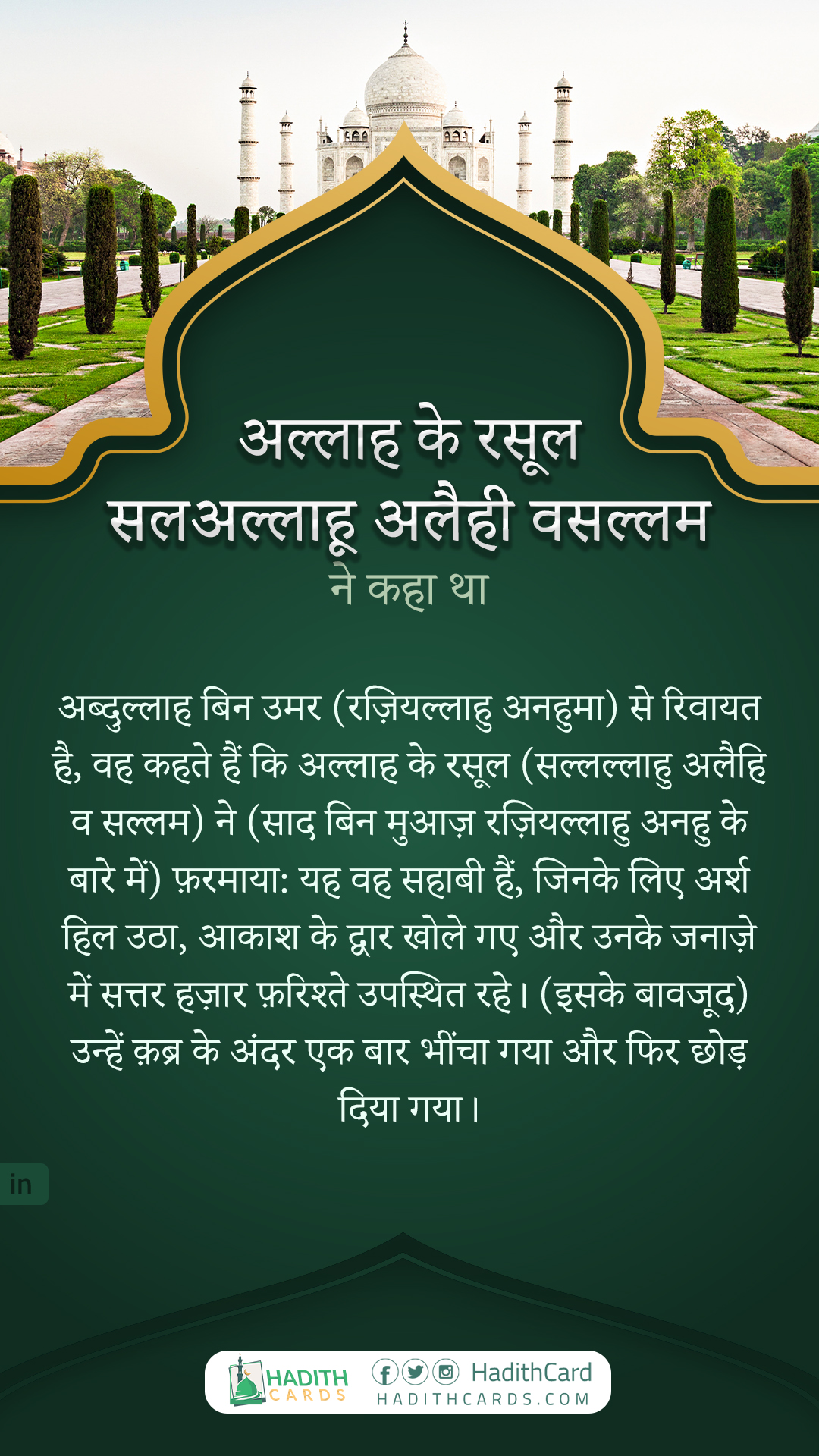 अब्दुल्लाह बिन उमर (रज़ियल्लाहु अनहुमा) से रिवायत है, वह कहते हैं कि अल्लाह के रसूल (सल्लल्लाहु अलैहि व सल्लम) ने (साद बिन मुआज़ रज़ियल्लाहु अनहु के बारे में) फ़रमाया: यह वह सहाबी हैं, जिनके लिए अर्श हिल उठा, आकाश के द्वार खोले गए और उनके जनाज़े में सत्तर हज़ार फ़रिश्ते उपस्थित रहे। (इसके बावजूद) उन्हें क़ब्र के अंदर एक बार भींचा गया और फिर छोड़ दिया गया।