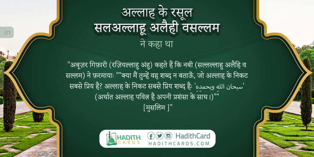 अबूज़र गिफ़ारी (रज़ियल्लाहु अंहु) कहते हैं कि नबी (सल्लल्लाहु अलैहि व सल्लम) ने फ़रमायाः "क्या मैं तुम्हें वह शब्द न बताऊँ, जो अल्लाह के निकट सबसे प्रिय है? अल्लाह के निकट सबसे प्रिय शब्द हैः 'سبحان اللهِ وبحمدِهِ' (अर्थात अल्लाह पवित्र है अपनी प्रशंसा के साथ।)