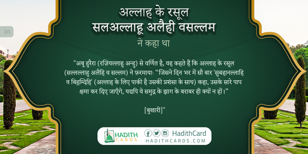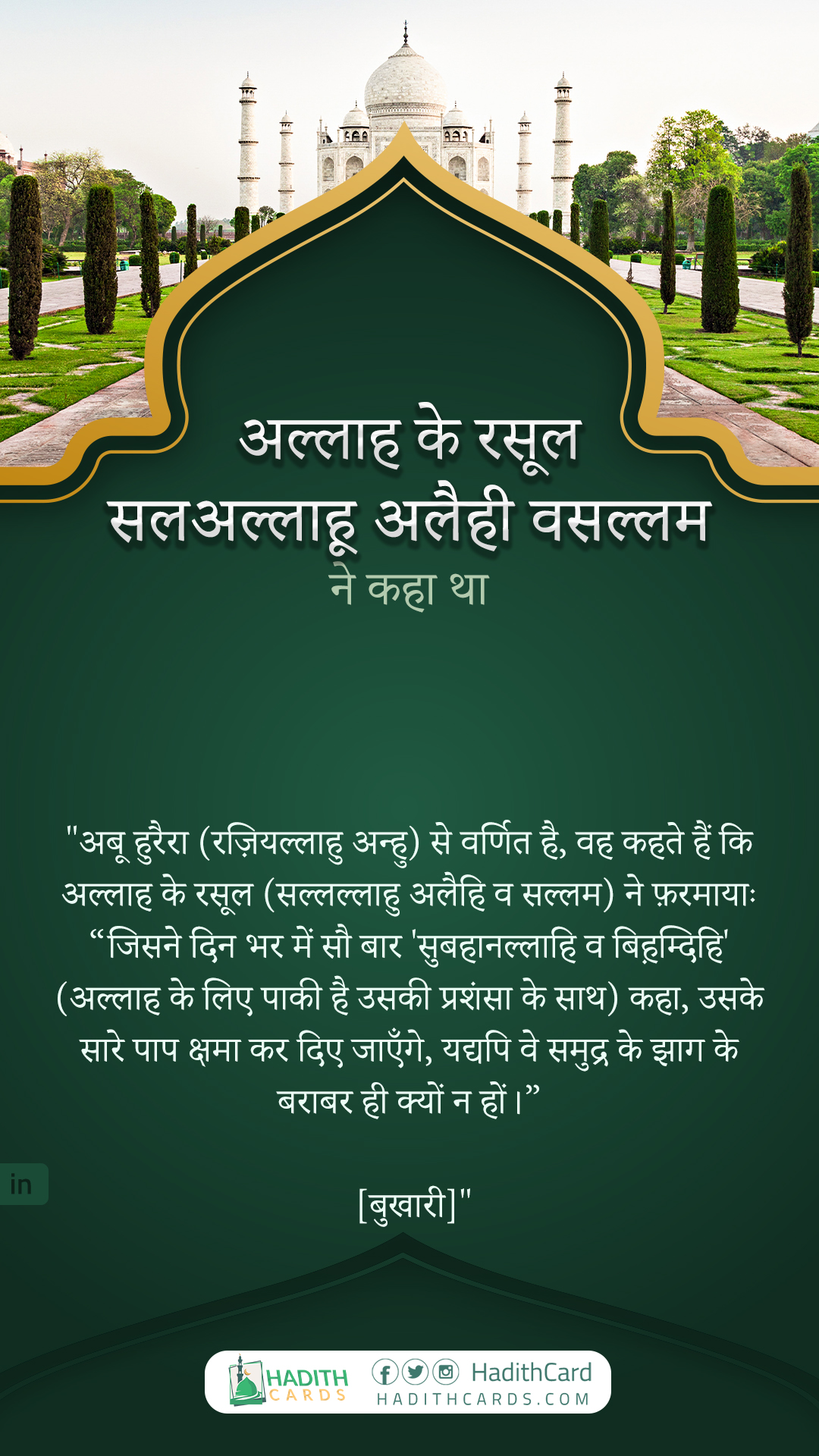 अबू हुरैरा (रज़ियल्लाहु अन्हु) से वर्णित है, वह कहते हैं कि अल्लाह के रसूल (सल्लल्लाहु अलैहि व सल्लम) ने फ़रमायाः “जिसने दिन भर में सौ बार 'सुबहानल्लाहि व बिह़म्दिहि' (अल्लाह के लिए पाकी है उसकी प्रशंसा के साथ) कहा, उसके सारे पाप क्षमा कर दिए जाएँगे, यद्यपि वे समुद्र के झाग के बराबर ही क्यों न हों।