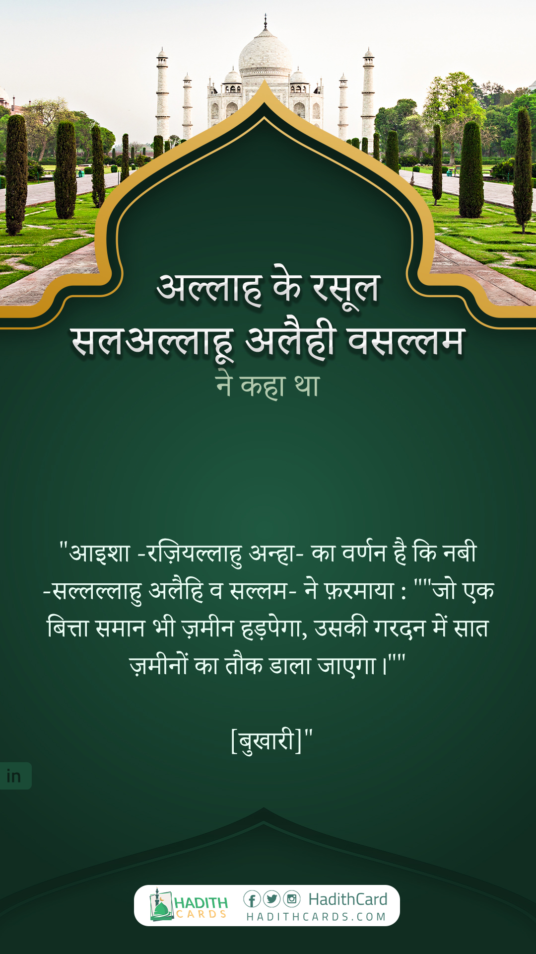 आइशा -रज़ियल्लाहु अन्हा- का वर्णन है कि नबी -सल्लल्लाहु अलैहि व सल्लम- ने फ़रमाया : "जो एक बित्ता समान भी ज़मीन हड़पेगा, उसकी गरदन में सात ज़मीनों का तौक डाला जाएगा।