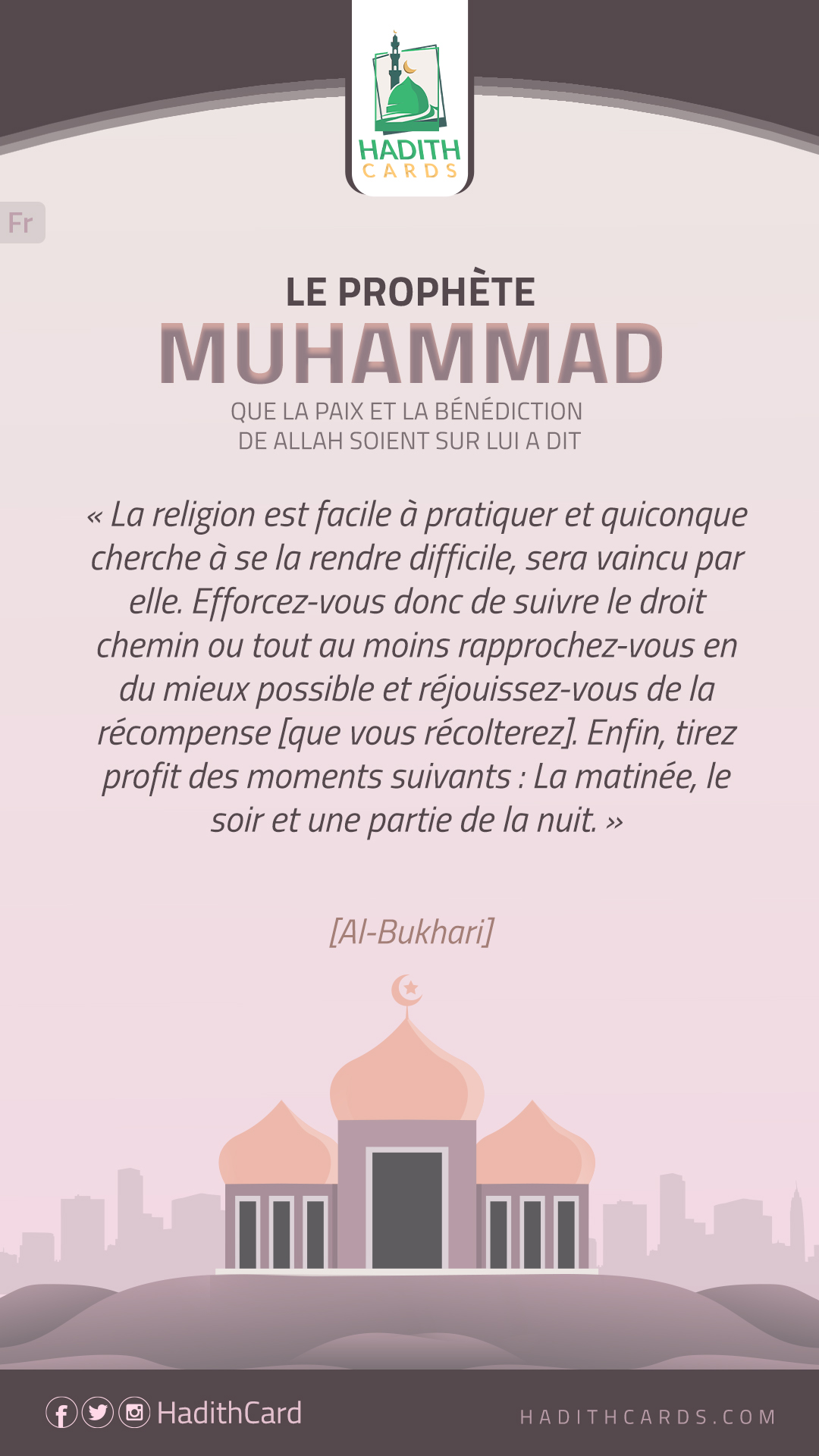 La religion est facile à pratiquer et quiconque cherche à se la rendre difficile, sera vaincu par elle. Efforcez-vous donc de suivre le droit chemin ou tout au moins rapprochez-vous en du mieux possible et réjouissez-vous de la récompense [que vous récolterez]. Enfin, tirez profit des moments suivants : La matinée, le soir et une partie de la nuit