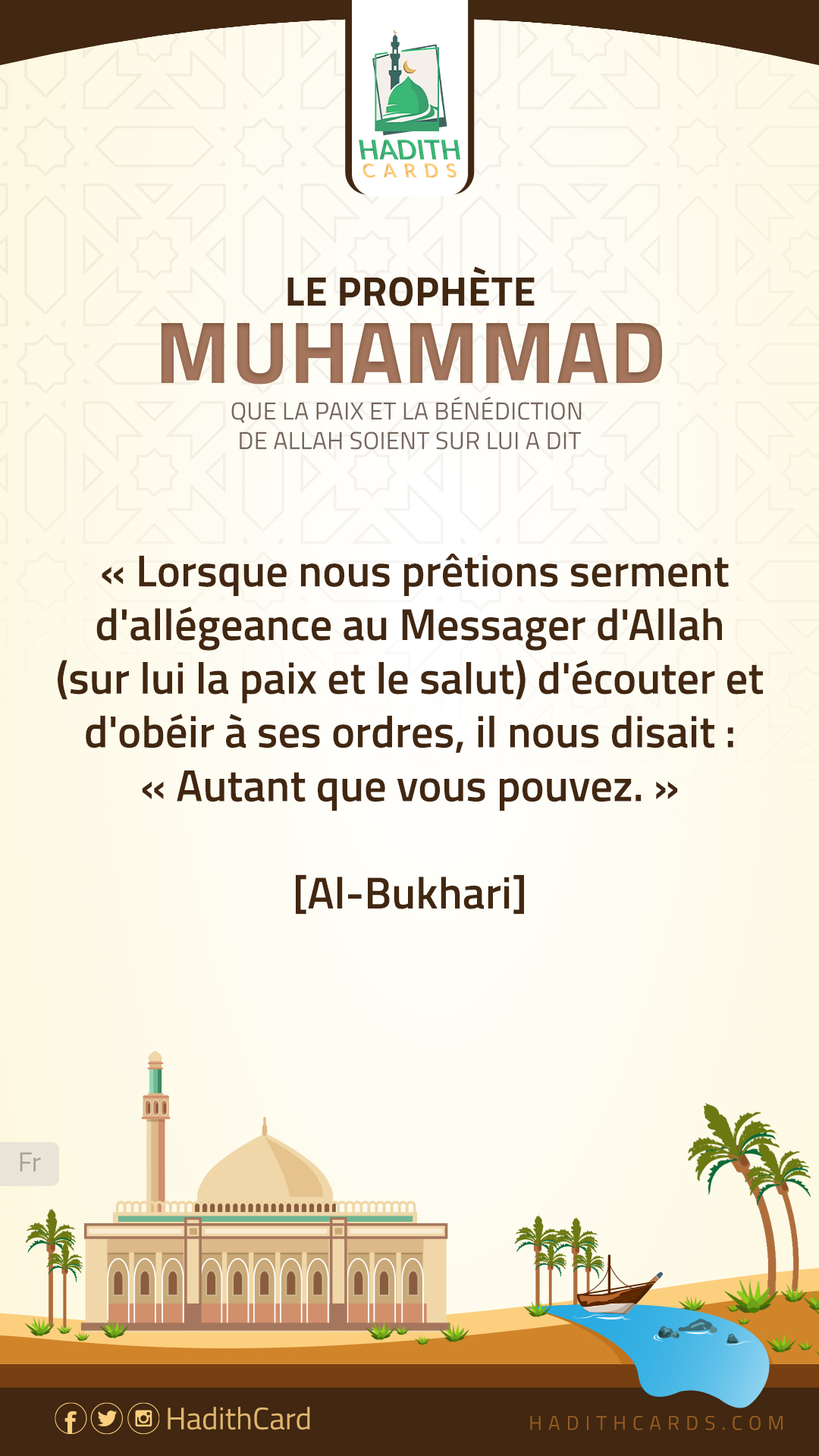 Lorsque nous prêtions serment d'allégeance au Messager d'Allah (sur lui la paix et le salut) d'écouter et d'obéir à ses ordres, il nous disait : « Autant que vous pouvez