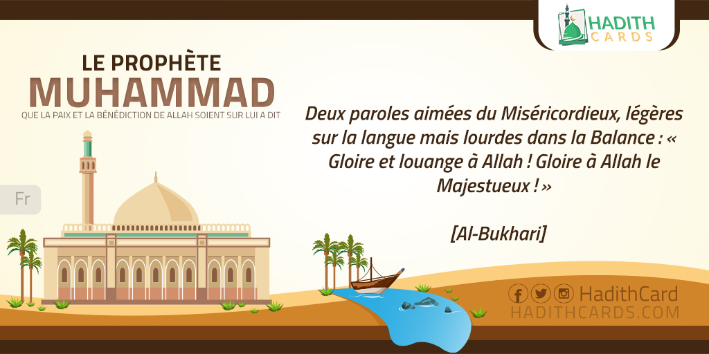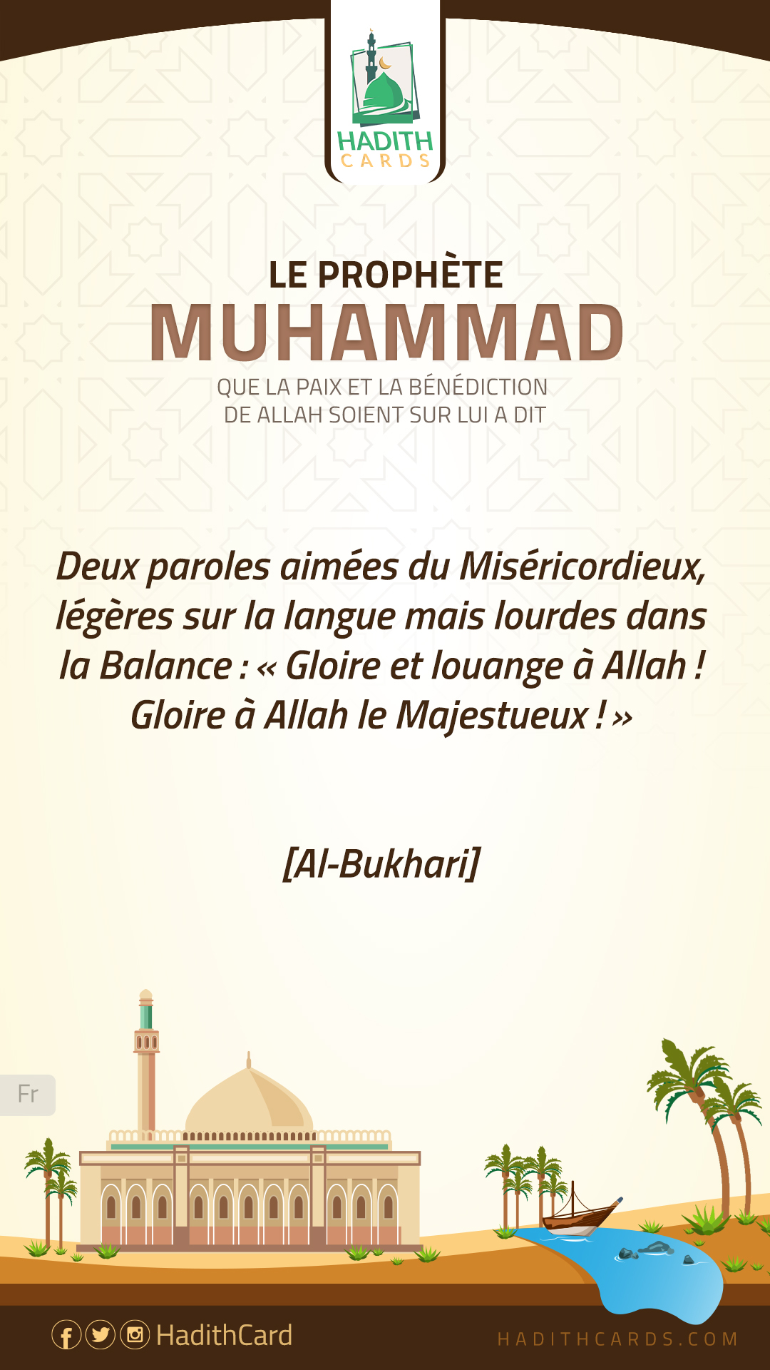 Deux paroles aimées du Miséricordieux, légères sur la langue mais lourdes dans la Balance : « Gloire et louange à Allah ! Gloire à Allah le Majestueux !