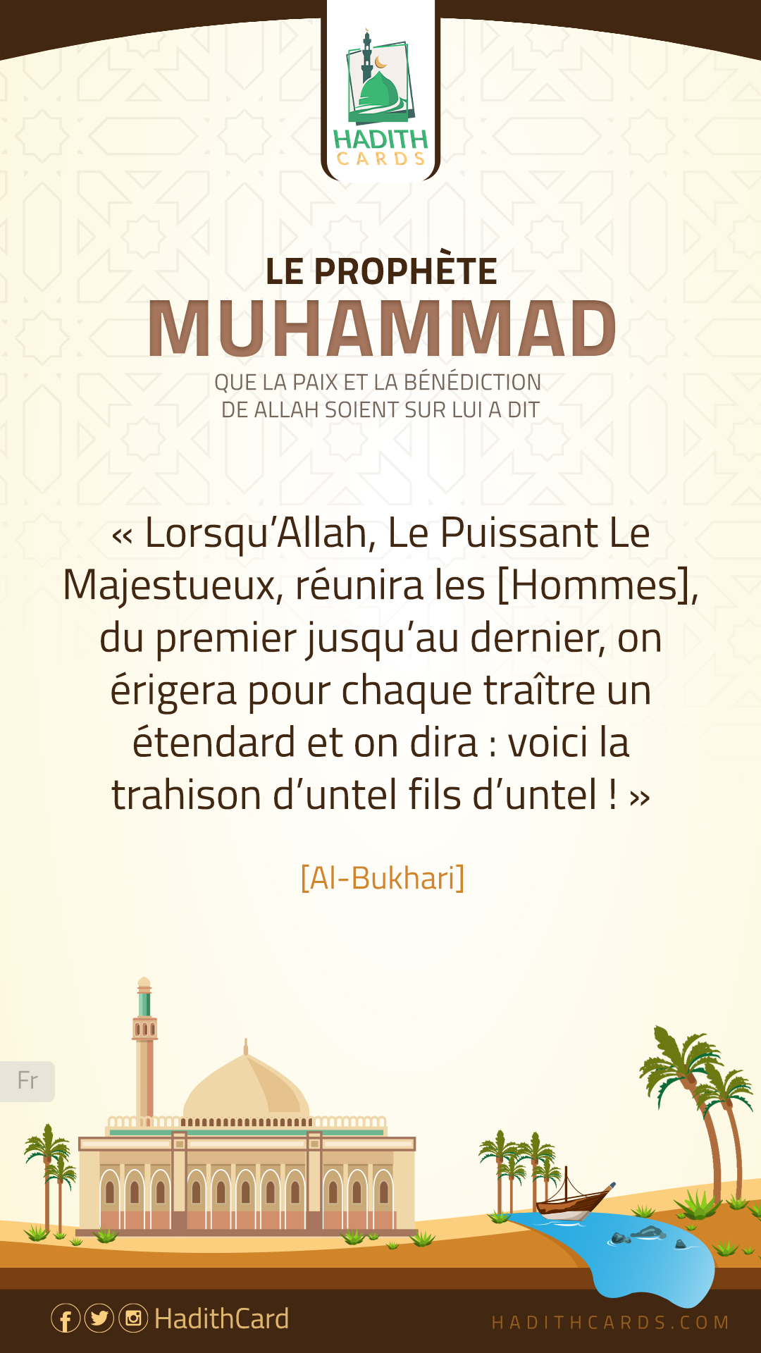 Lorsqu’Allah, Le Puissant Le Majestueux, réunira les [Hommes], du premier jusqu’au dernier, on érigera pour chaque traître un étendard et on dira : voici la trahison d’untel fils d’untel !