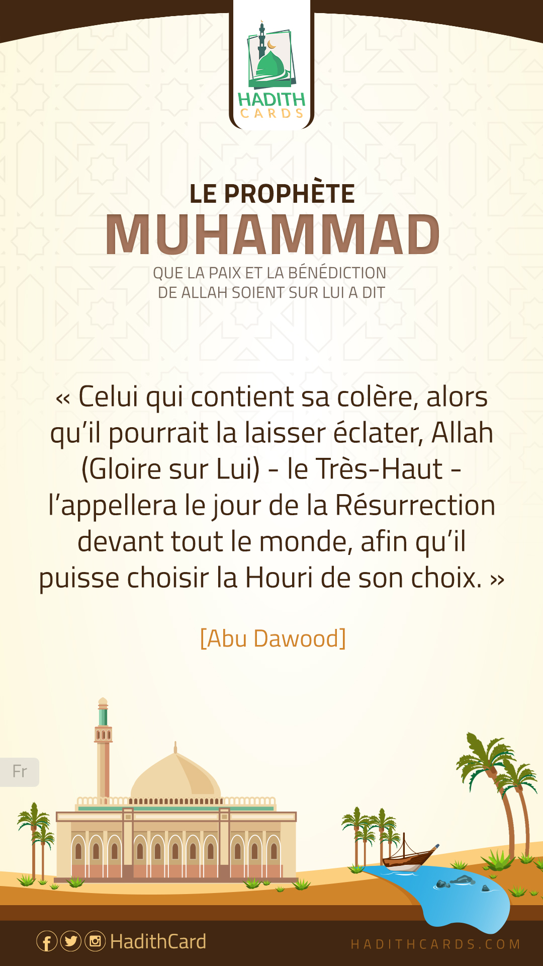Celui qui contient sa colère, alors qu’il pourrait la laisser éclater, Allah (Gloire sur Lui) - le Très-Haut - l’appellera le jour de la Résurrection devant tout le monde, afin qu’il puisse choisir la Houri de son choix