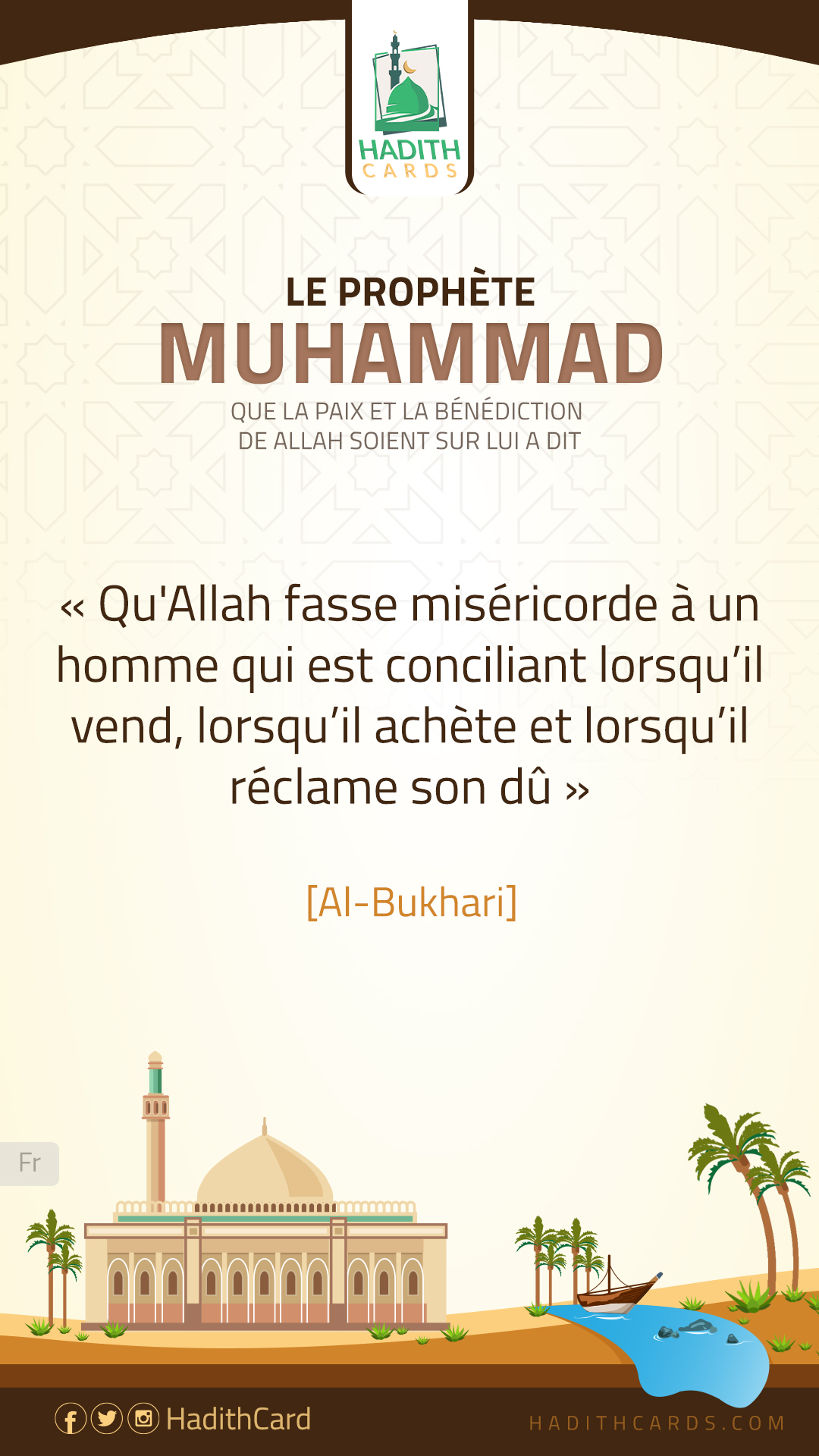 Qu'Allah fasse miséricorde à un homme qui est conciliant lorsqu’il vend, lorsqu’il achète et lorsqu’il réclame son dû