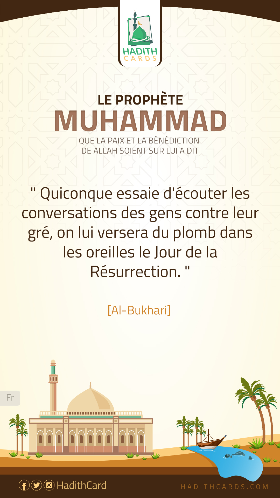Quiconque essaie d'écouter les conversations des gens contre leur gré, on lui versera du plomb dans les oreilles le Jour de la Résurrection
