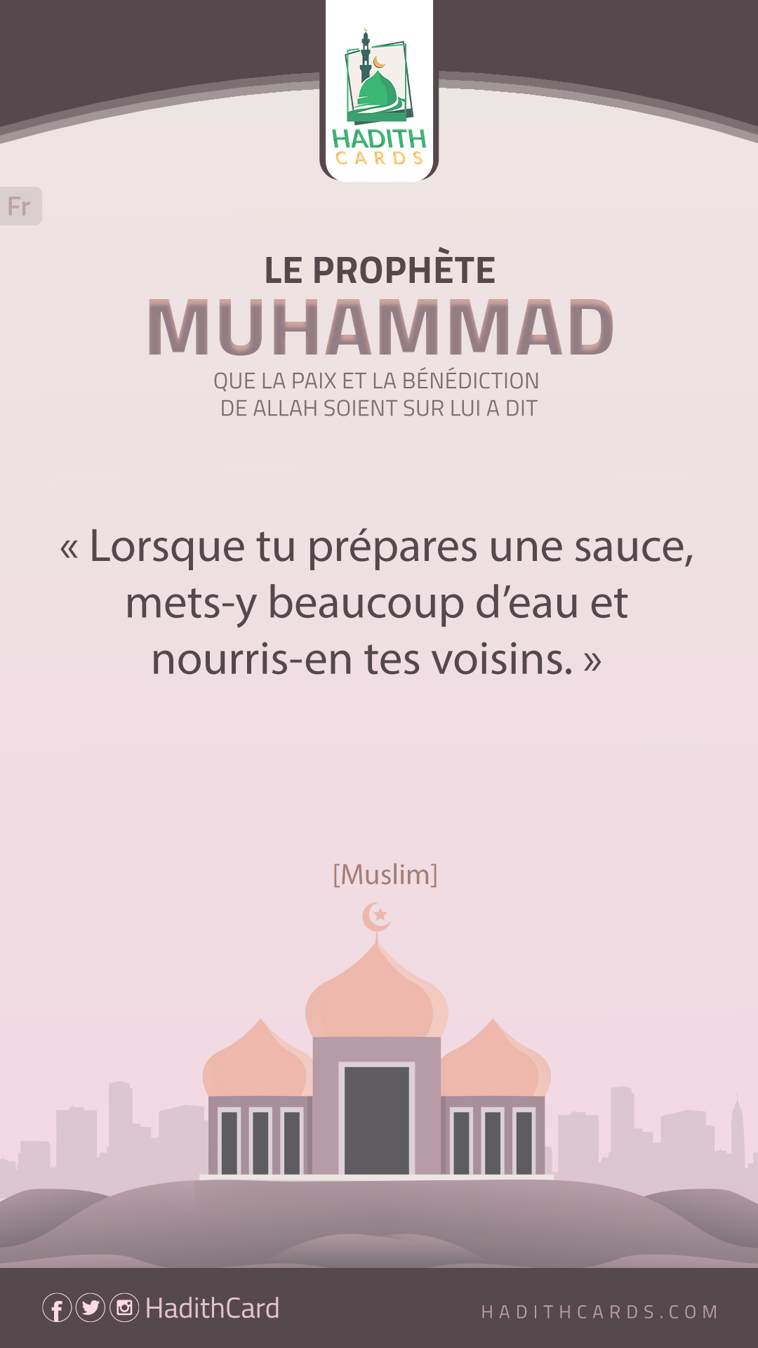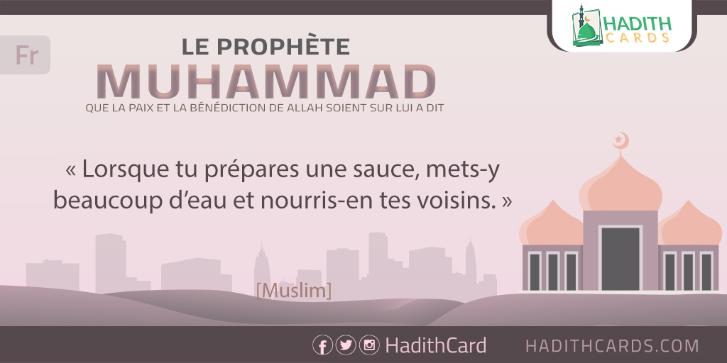 "«إذا طبختَ مَرَقَة, فأكثر ماءها, وتعاهدْ جِيْرانك». [صحيح.] - [رواه مسلم.]"