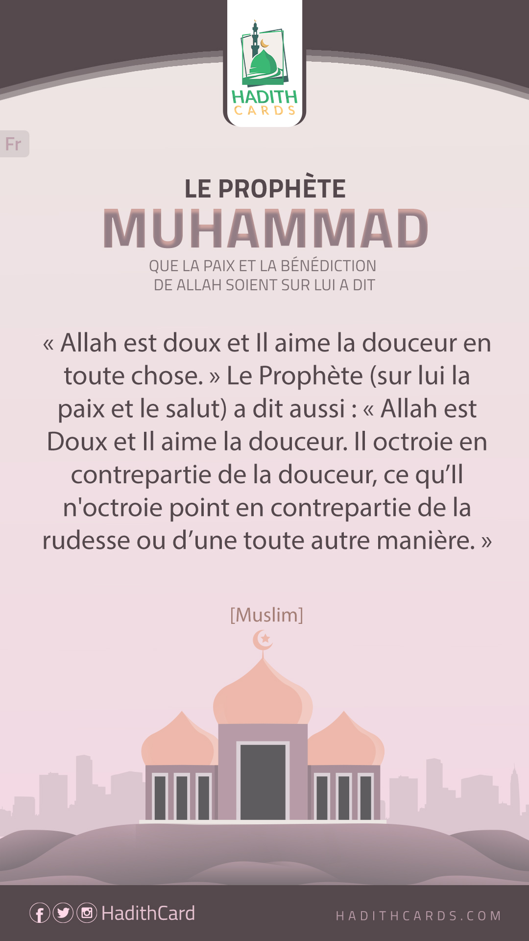 Allah est doux et Il aime la douceur en toute chose. » Le Prophète (sur lui la paix et le salut) a dit aussi : « Allah est Doux et Il aime la douceur. Il octroie en contrepartie de la douceur, ce qu’Il n'octroie point en contrepartie de la rudesse ou d’une toute autre manièr