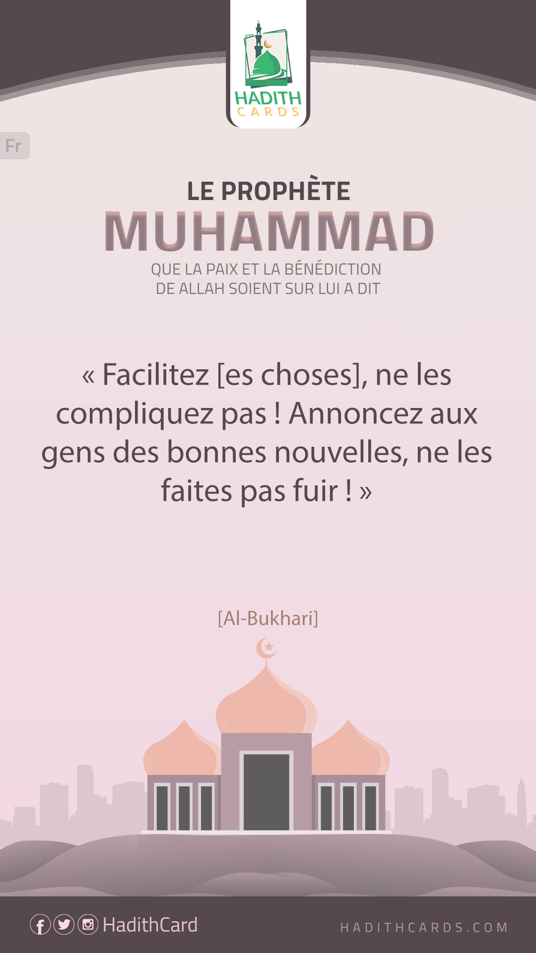 "«يَسِّرُوا وَلاَ تُعَسِّرُوا، وَبَشِّرُوا وَلاَ تُنَفِّرُوا». [صحيح.] - [متفق عليه.]"