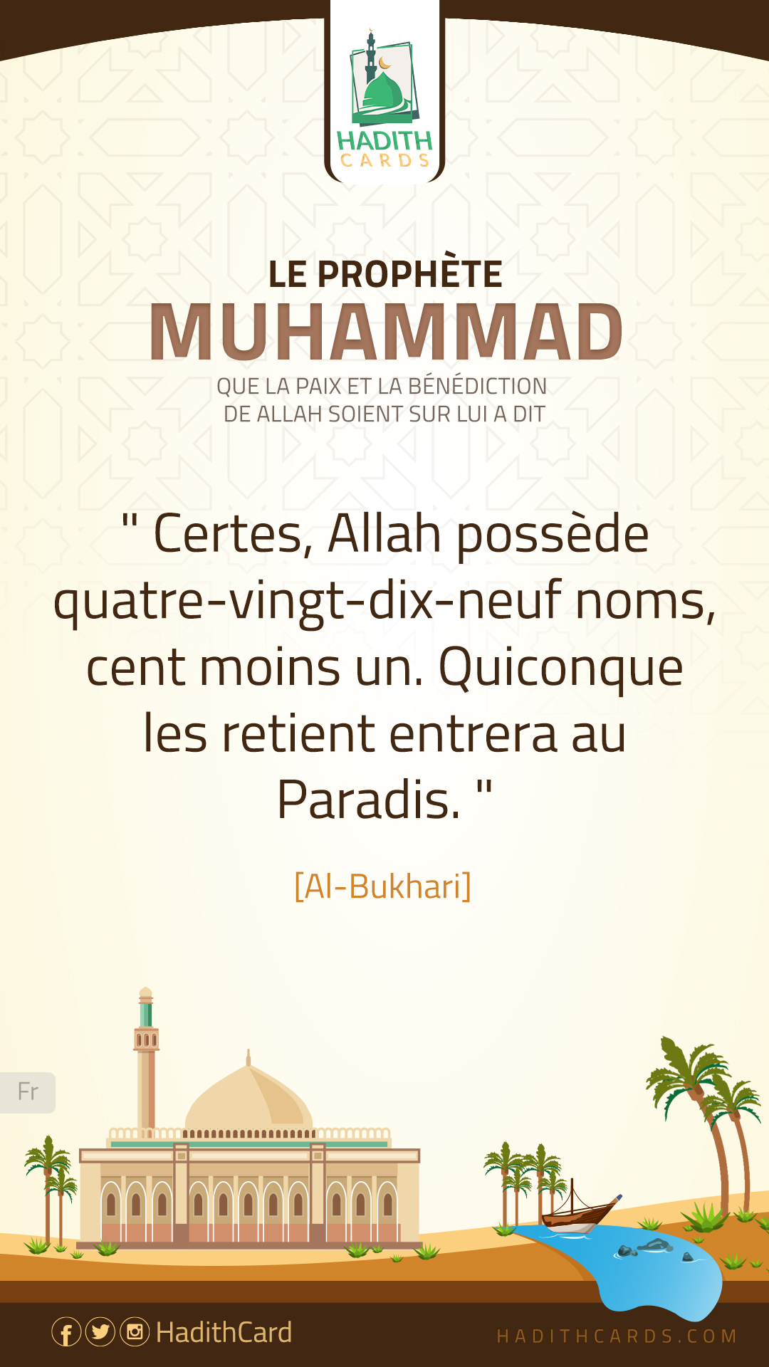 Certes, Allah possède quatre-vingt-dix-neuf noms, cent moins un. Quiconque les retient entrera au Paradis