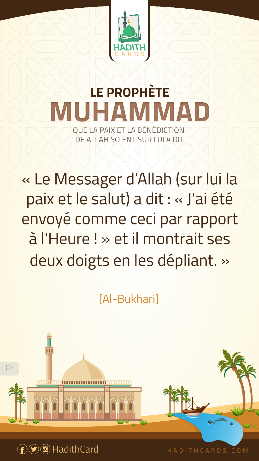Le Messager d’Allah (sur lui la paix et le salut) a dit : « J'ai été envoyé comme ceci par rapport à l'Heure ! » et il montrait ses deux doigts en les dépliant