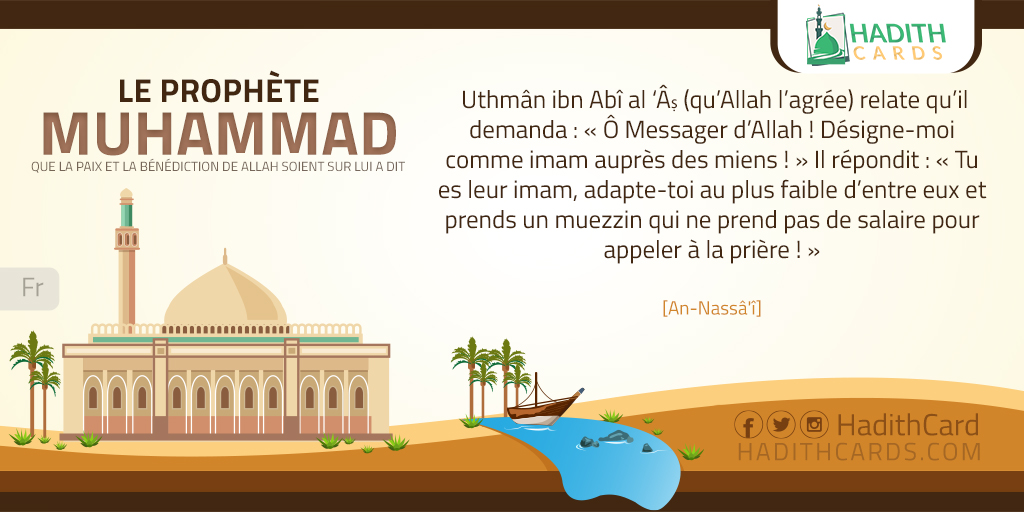Uthmân ibn Abî al ‘Âṣ (qu’Allah l’agrée) relate qu’il demanda : « Ô Messager d’Allah ! Désigne-moi comme imam auprès des miens ! » Il répondit : « Tu es leur imam, adapte-toi au plus faible d’entre eux et prends un muezzin qui ne prend pas de salaire pour appeler à la prière !