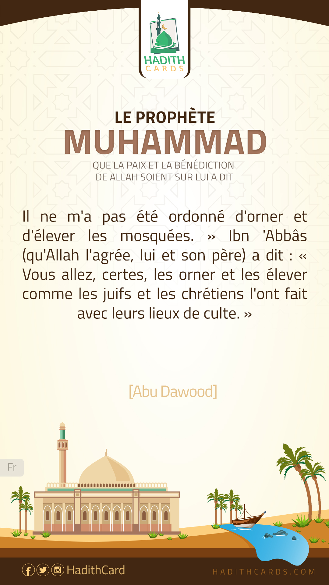 Il ne m'a pas été ordonné d'orner et d'élever les mosquées. » Ibn 'Abbâs (qu'Allah l'agrée, lui et son père) a dit : « Vous allez, certes, les orner et les élever comme les juifs et les chrétiens l'ont fait avec leurs lieux de culte
