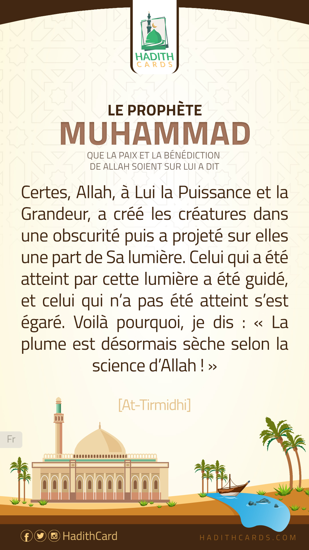 Certes, Allah, à Lui la Puissance et la Grandeur, a créé les créatures dans une obscurité puis a projeté sur elles une part de Sa lumière. Celui qui a été atteint par cette lumière a été guidé, et celui qui n’a pas été atteint s’est égaré. Voilà pourquoi, je dis : « La plume est désormais sèche selon la science d’Allah !