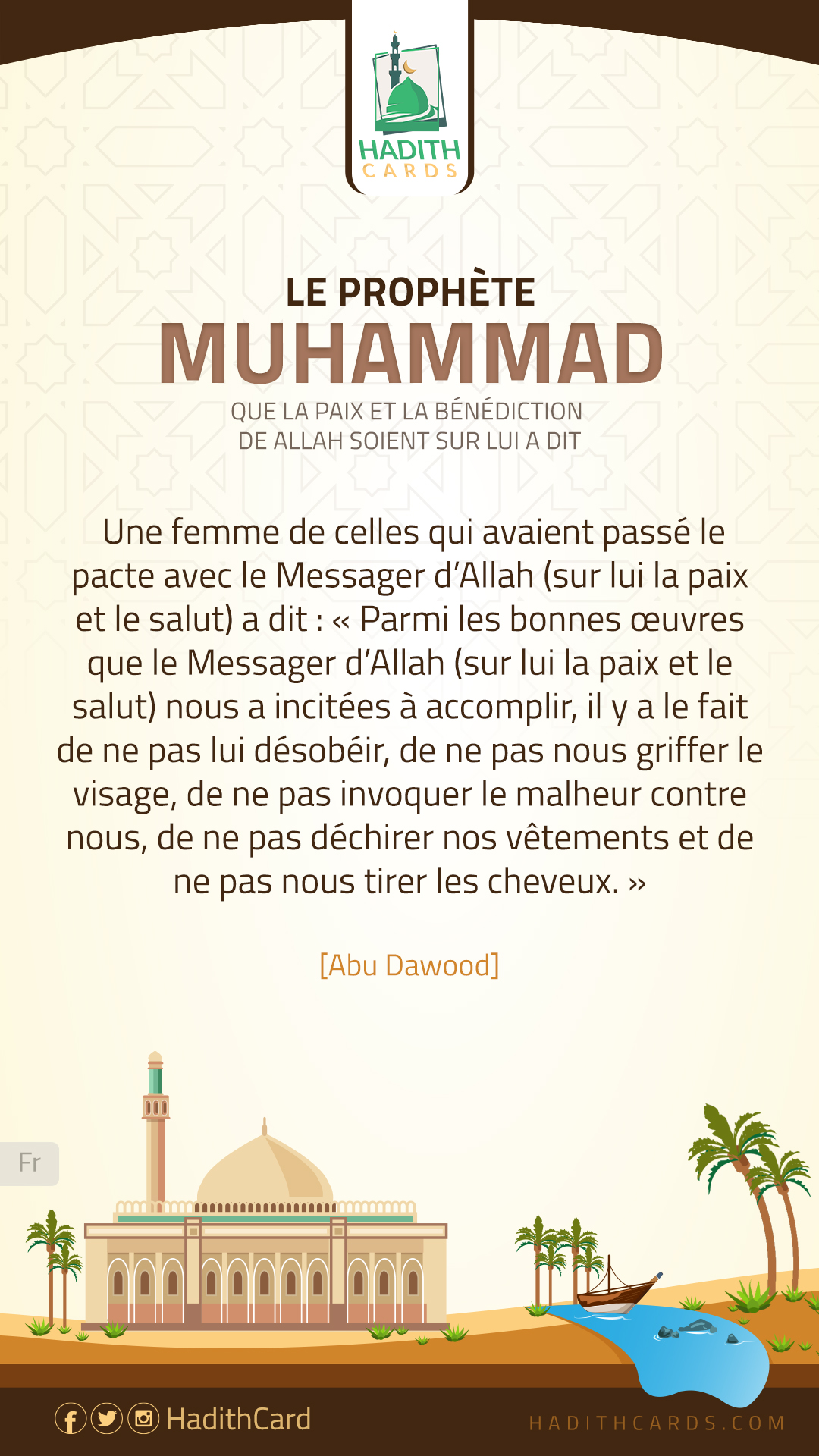 Une femme de celles qui avaient passé le pacte avec le Messager d’Allah (sur lui la paix et le salut) a dit : « Parmi les bonnes œuvres que le Messager d’Allah (sur lui la paix et le salut) nous a incitées à accomplir, il y a le fait de ne pas lui désobéir, de ne pas nous griffer le visage, de ne pas invoquer le malheur contre nous, de ne pas déchirer nos vêtements et de ne pas nous tirer les cheveux