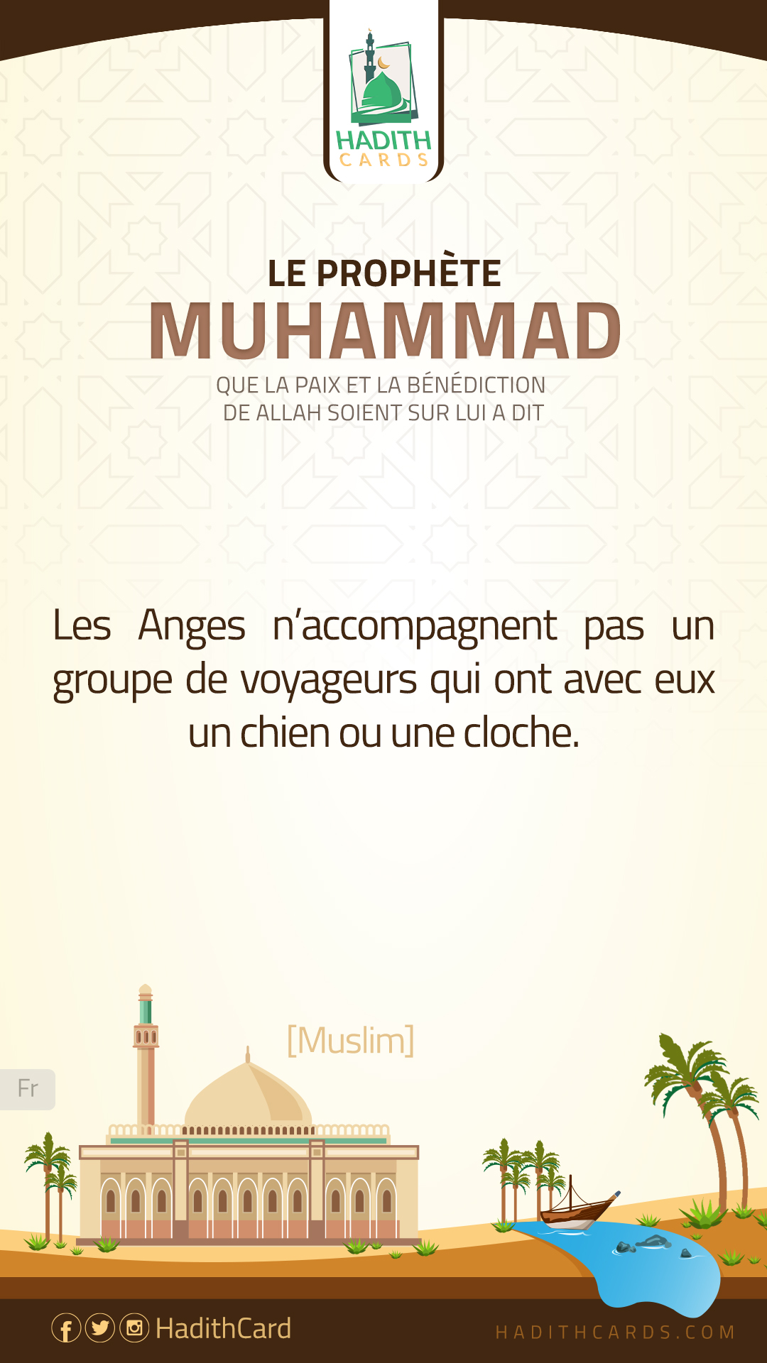 : «لا تَصْحَبُ الملائكة رُفْقَةً فيها كلب أو جَرَسٌ». [صحيح.] - [رواه مسلم.]
