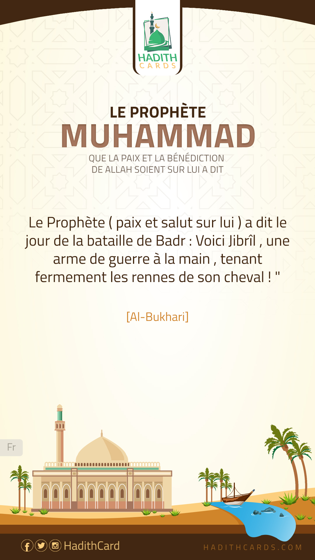 عن ابن عباس -رضي الله عنهما- أن النبي -صلى الله عليه وسلم- قال يوم بدر: «هذا جبريلُ، آخذٌ برأس فَرَسِه، عليه أَدَاةُ الحَرْب».