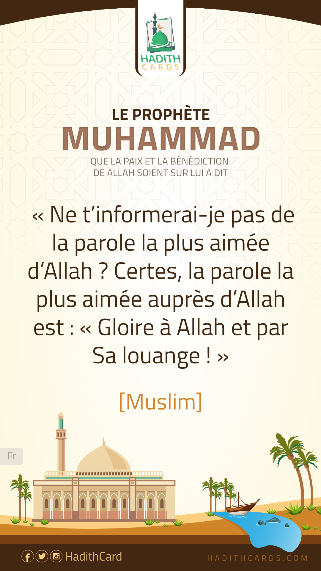 Ne t’informerai-je pas de la parole la plus aimée d’Allah ? Certes, la parole la plus aimée auprès d’Allah est : « Gloire à Allah et par Sa louange !