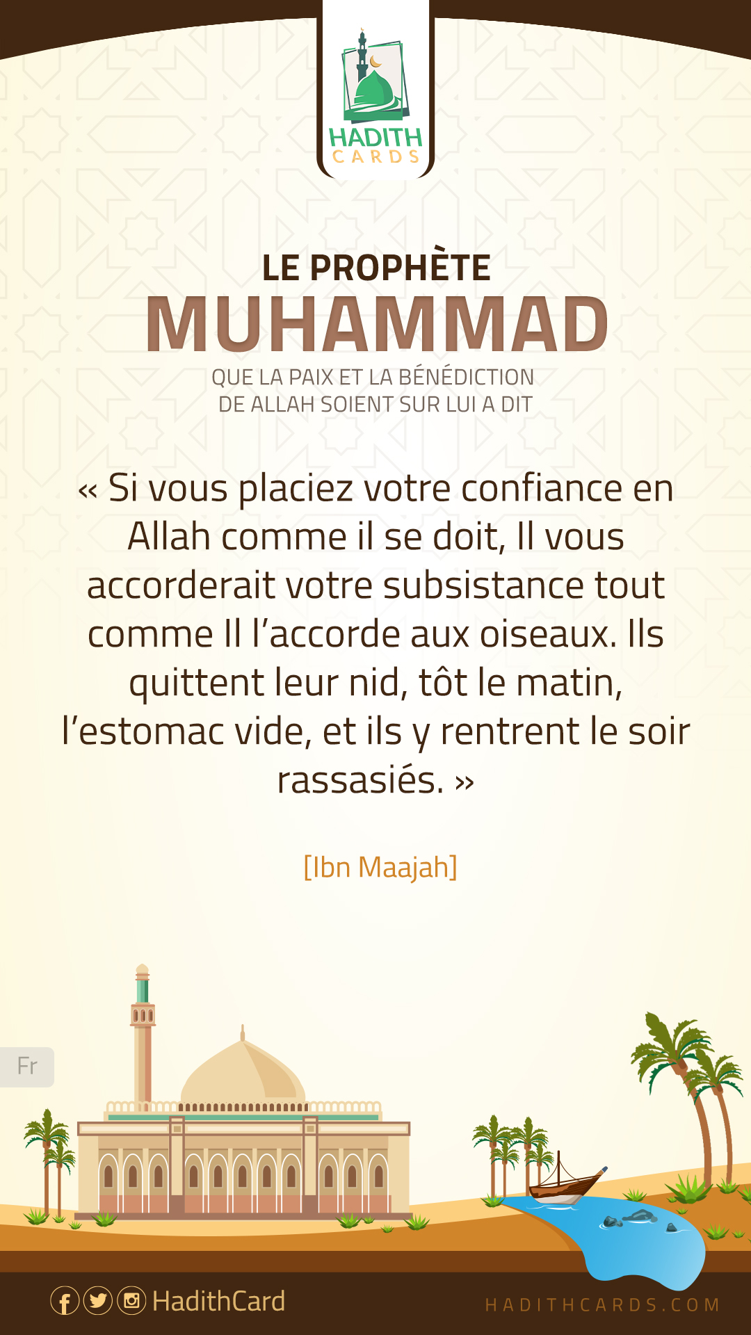 Si vous placiez votre confiance en Allah comme il se doit, Il vous accorderait votre subsistance tout comme Il l’accorde aux oiseaux. Ils quittent leur nid, tôt le matin, l’estomac vide, et ils y rentrent le soir rassasiés