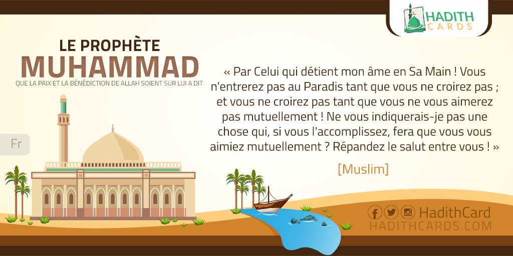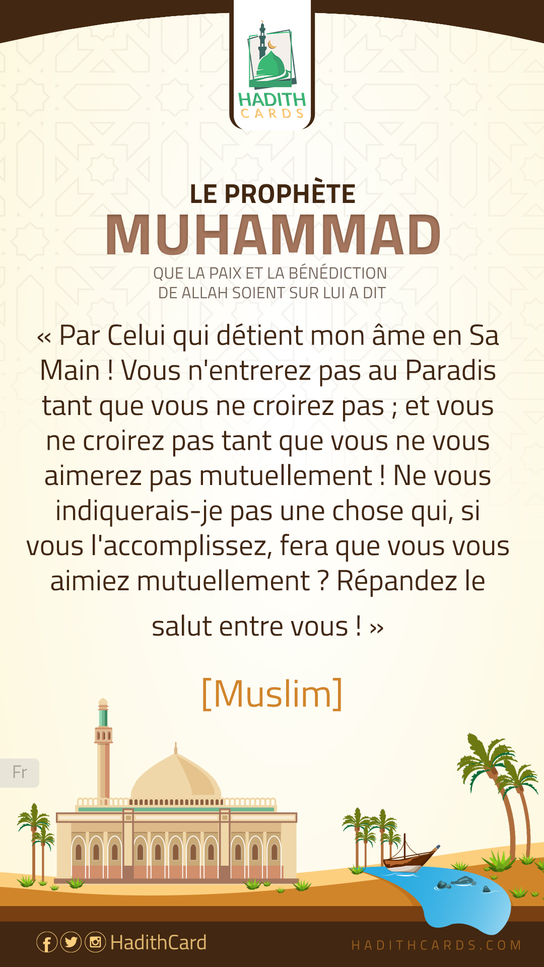 Par Celui qui détient mon âme en Sa Main ! Vous n'entrerez pas au Paradis tant que vous ne croirez pas ; et vous ne croirez pas tant que vous ne vous aimerez pas mutuellement ! Ne vous indiquerais-je pas une chose qui, si vous l'accomplissez, fera que vous vous aimiez mutuellement ? Répandez le salut entre vous !