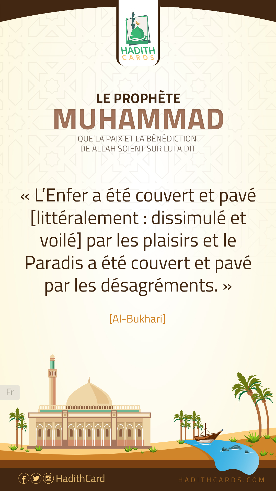 L’Enfer a été couvert et pavé [littéralement : dissimulé et voilé] par les plaisirs et le Paradis a été couvert et pavé par les désagréments